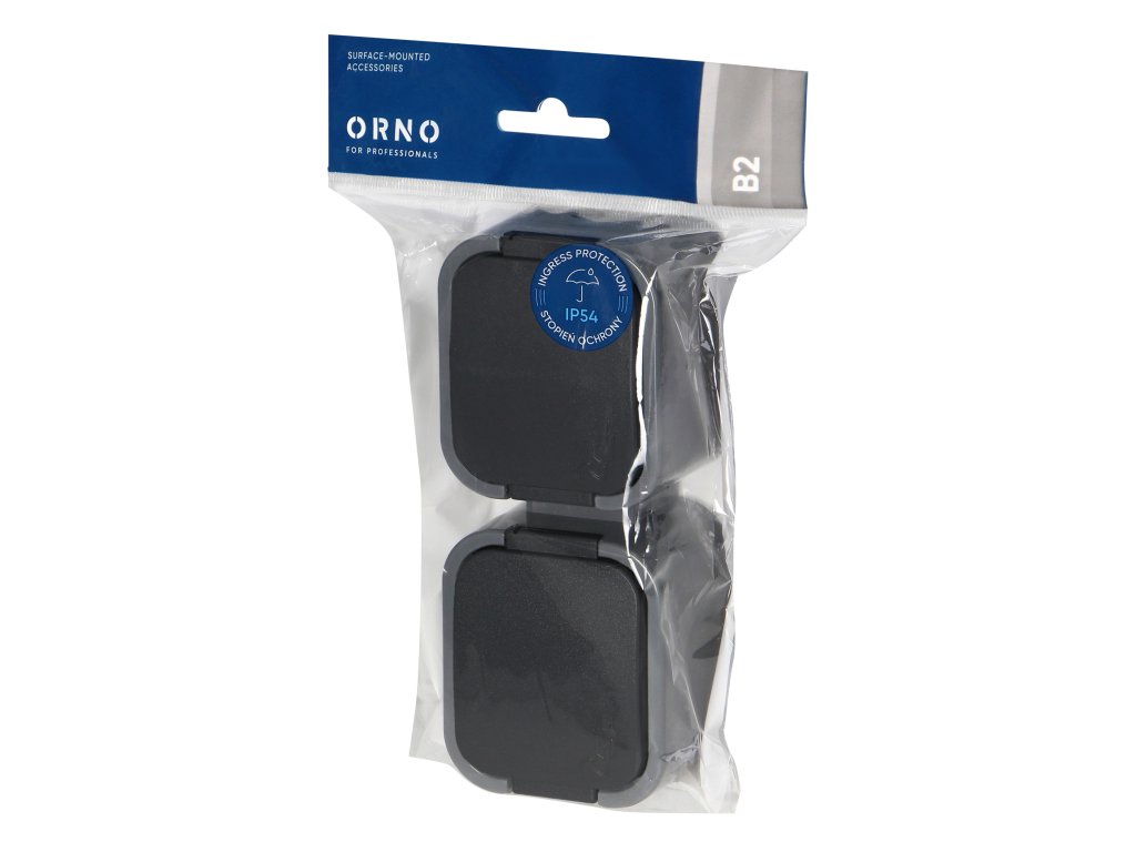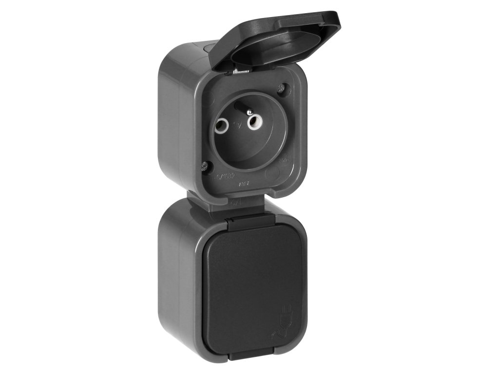 Séria zásuviek a vypínačov B2, s krytím IP54, odolná voči prachu a vlhkosti. Séria sa vyznačuje nadčasovým tvarom a robustným krytom. Ideálna na inštaláciu v priemyselných zariadeniach a domácnostiach. Vypínače sú vybavené rýchlospojkami, zatiaľ čo zásuvky sú vybavené tradičnými skrutkovými spojmi.Dvojitá, vertikálna francúzska zásuvka 2x2P+E, odolná voči špliechaniu s krytom. Určená na povrchovú montáž. Vhodná všade tam, kde je potrebná ochrana proti prachu a špliechajúcej vode (IP54).