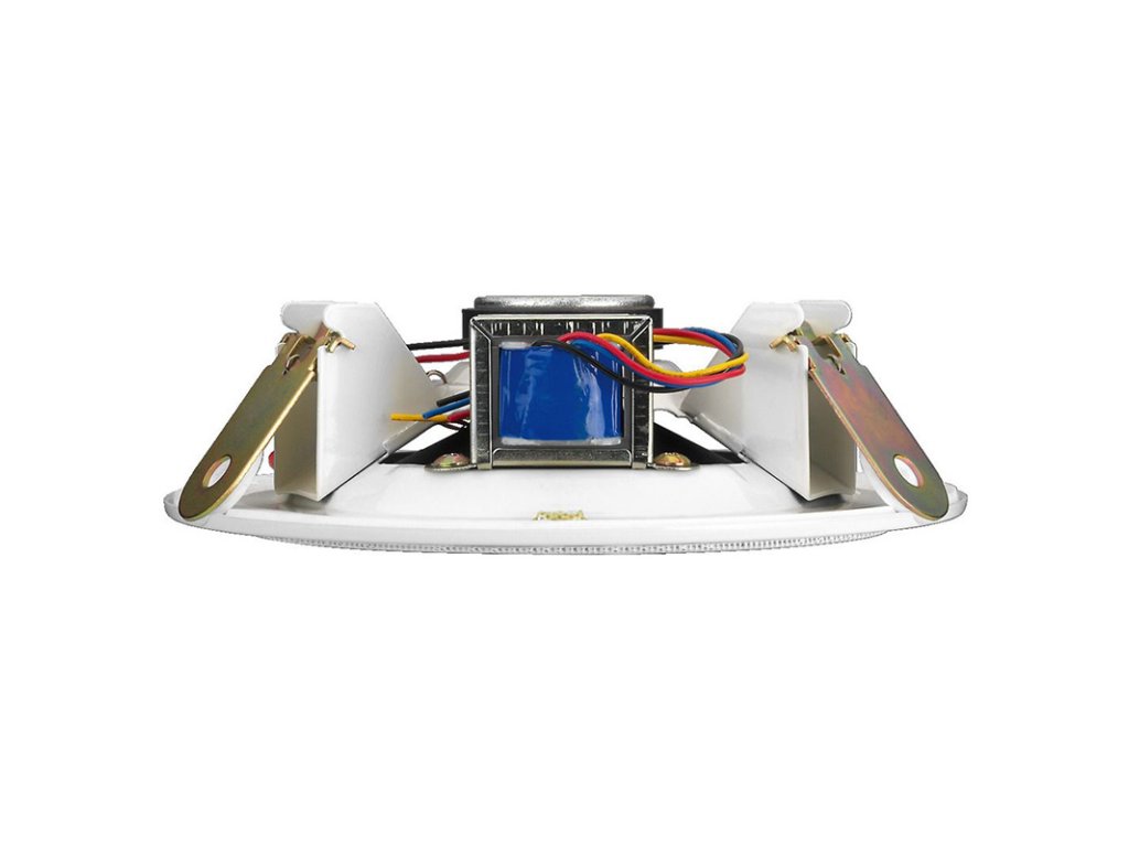 Dvojkónusový plnorozsahový reproduktor s menovitým výkonom 6W určený pre použitie v systémoch PA v technológii 100V. Montáž do stropu s hrúbkou od 5 do 22 mm. Vybavený transformátorom, ktorý reguluje jeho výkon - v závislosti od pripojenia pracuje s výkonom 6, 3 alebo 1,5 W. To umožňuje pripojiť k zosilňovaču s nízkym výkonom (napr. 30 W) až 10 reproduktorov pracujúcich v režime 3 W. Vyrobený z vysokokvalitných materiálov zaisťujúcich bezproblémové používanie počas dlhého obdobia. Vďaka malým rozmerom veľmi dobre zapadne do okolia a je takmer neviditeľný. Ideálne sa hodí do malých priestorov, ako sú čakárne, konferenčné miestnosti, malé obchody.