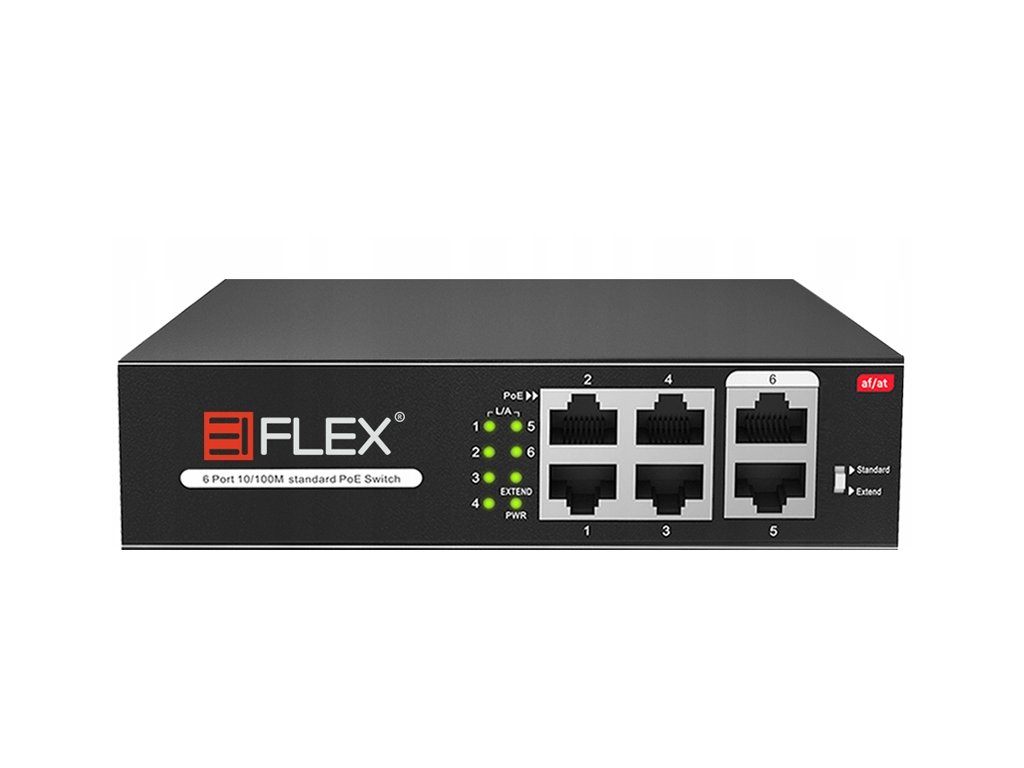 EI-H1064PL značky EIFLEX je univerzálny switch POE určený na pripojenie a napájanie sieťových zariadení, ako sú IP kamery alebo IP videovrátniky. Zariadenie má 4 porty RJ45 s rýchlosťou 10/100 Mbps s podporou PoE napájania v štandarde IEEE 802.3at/802.af a 2 porty RJ45 s rýchlosťou 10/100 Mbps typu Uplink. PoE napájací rozpočet zariadenia je do 65W pre celý switch a do max. 30W na jeden port.