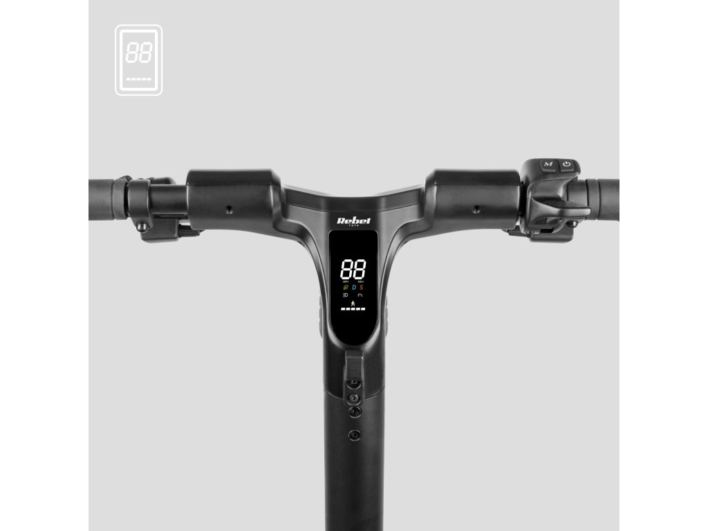 Kolobežka REBEL FAST WHEELS PRO MAX zaisťuje pohodlie pri jazde. Jedným tlačidlom môžete spravovať funkcie zariadenia a na vstavanom displeji si jednoducho skontrolujete zvolené parametre. Pre zvýšenie bezpečnosti počas jazdy je na volante miesto aj pre zvonček.
