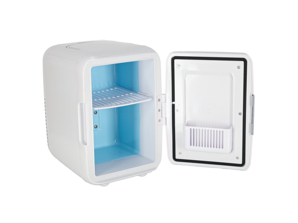 Biela cestovná chladnička s ergonomickým dizajnom udržiava teplotu chladených aj ohrievaných výrobkov. Možno ju pripojiť do bežnej elektrickej zásuvky aj do zásuvky cigaretového zapaľovača.