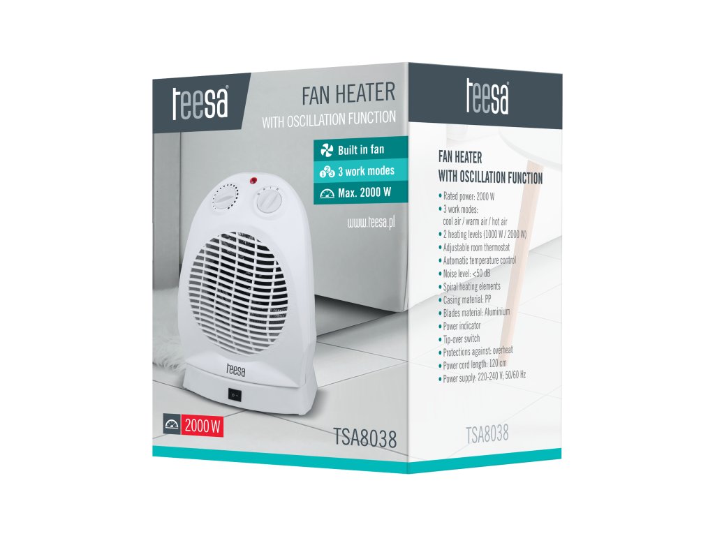 TSA8038 je jedným zo spoľahlivých termoventilátorov značky Teesa s funkciou oscilácie, ktorá je mimoriadne užitočná počas chladných aj horúcich dní. Zariadenie môže pracovať s dvoma úrovňami výkonu -1000 W a 2000 W a má zabudovaný termostat, takže si môžete nastaviť podmienky v miestnosti podľa svojich potrieb. Okrem toho je termoventilátor vybavený funkciou automatickej regulácie teploty, takže si môžete byť istí, že vami zvolená teplota bude zachovaná.