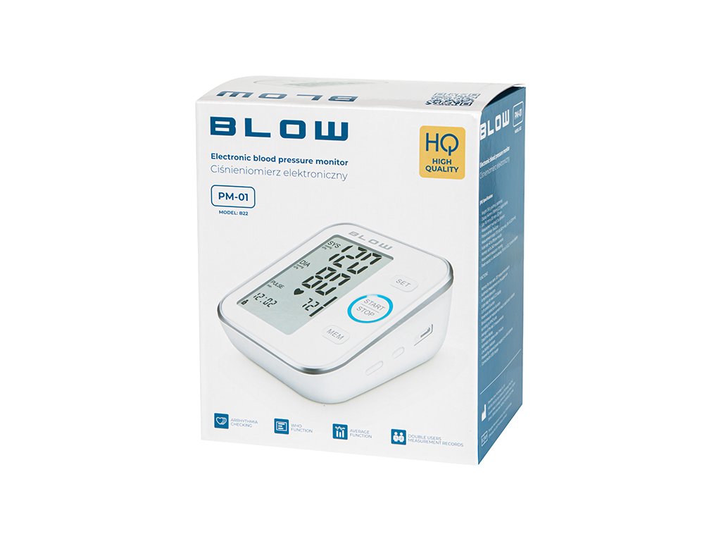 Tlakomer Blow PM-01 je plne automatické medicínske zariadenie, ktoré poskytuje presné meranie tlaku a pulzu. Detekuje arytmiu a kontroluje správne umiestnenie manžety, čo zvyšuje presnosť výsledkov. Veľký LCD displej uľahčuje čítanie, a pamäť pre dvoch používateľov (2x120 meraní) umožňuje sledovanie výsledkov. Zariadenie počíta priemer z posledných 3 meraní a automaticky sa vypne po minúte nečinnosti. Napájanie batériami (4x AAA) alebo cez sieťový adaptér (5V, 1A) robí tlakomer pohodlným pre použitie doma aj na cestách.
