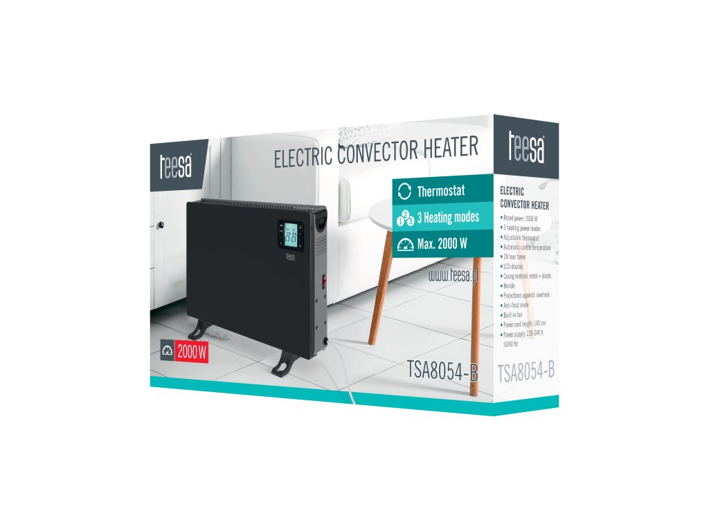 TSA8054 je moderný elektrický ohrievač, ktorý vďaka svojmu výkonu 2000 W zaisťuje efektívne a rýchle vykurovanie miestností. Zariadenie využíva konvekčnú technológiu , teda cirkuláciu vzduchu, ktorá umožňuje rovnomernú distribúciu tepla v miestnosti a dodatočne zvyšuje teplotu okolia už niekoľko minút po zapnutí, čo výrazne zvyšuje komfort v chladných dňoch.