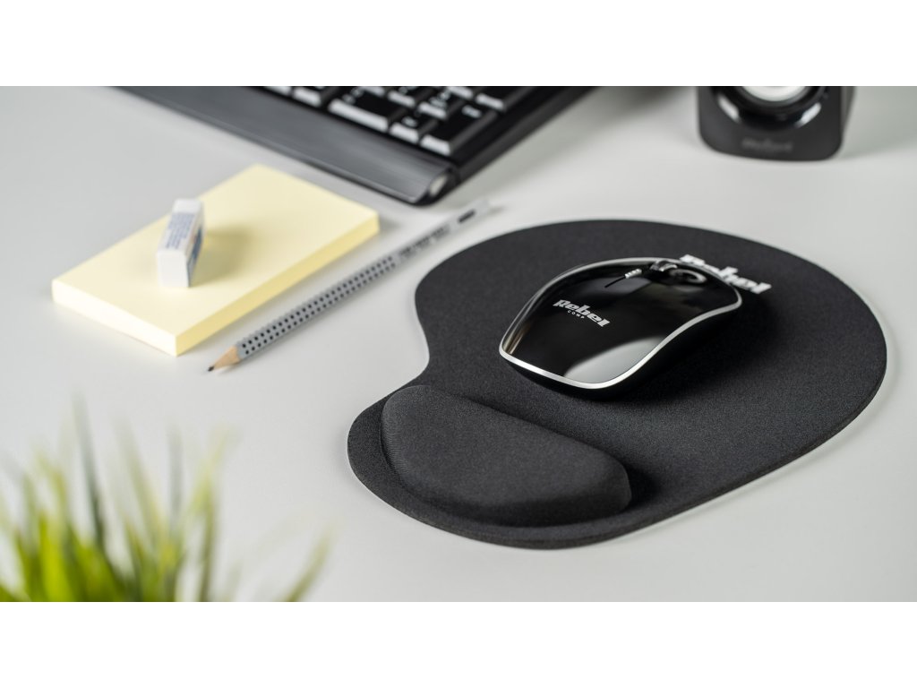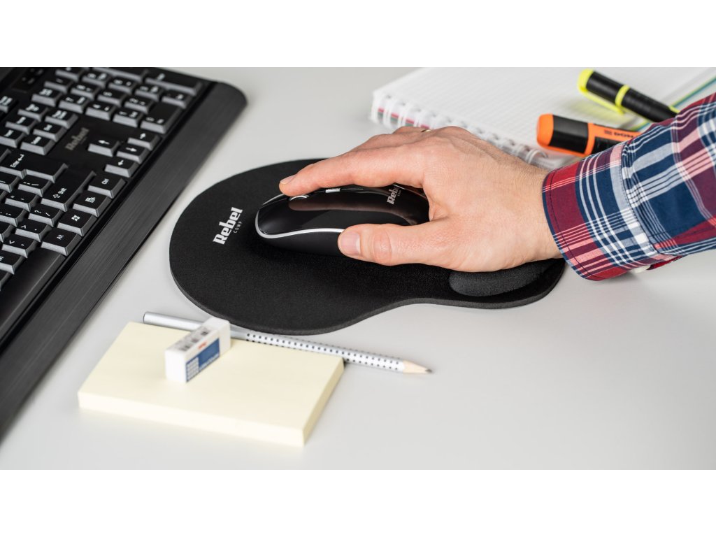 Dlhá práca na počítači môže viesť k únave a bolesti zápästia. Aby sa tomuto problému predišlo, podložka pod myš Rebel bola vybavená pohodlnou, mäkkou opierkou, ktorá sa prispôsobí tvaru vašej ruky, takže bude ideálna na kancelársku prácu. Podložka pod myš je potiahnutá pevnou čiernou tkaninou a je kompatibilná so všetkými typmi počítačových myší.