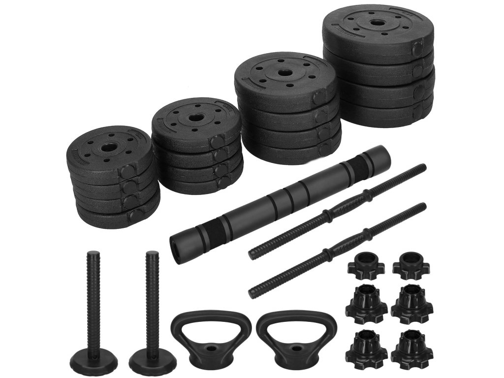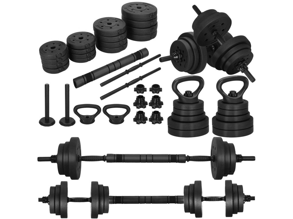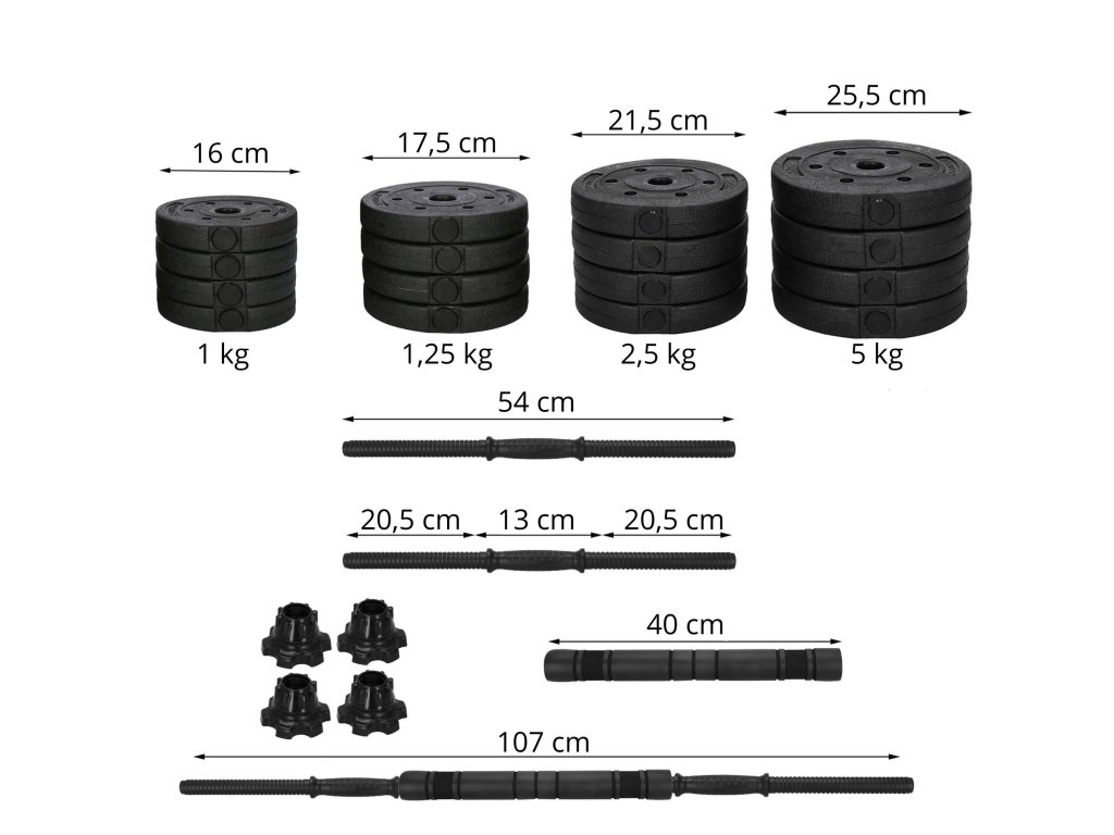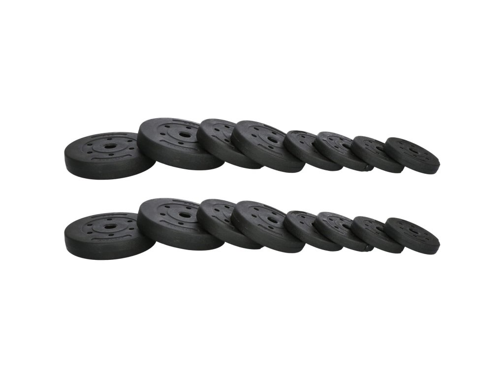 - Hmotnosť jednotlivých kotúčov: 4x 5 kg; 4x 2,5 kg; 4x 1,25 kg; 4x 1 kg