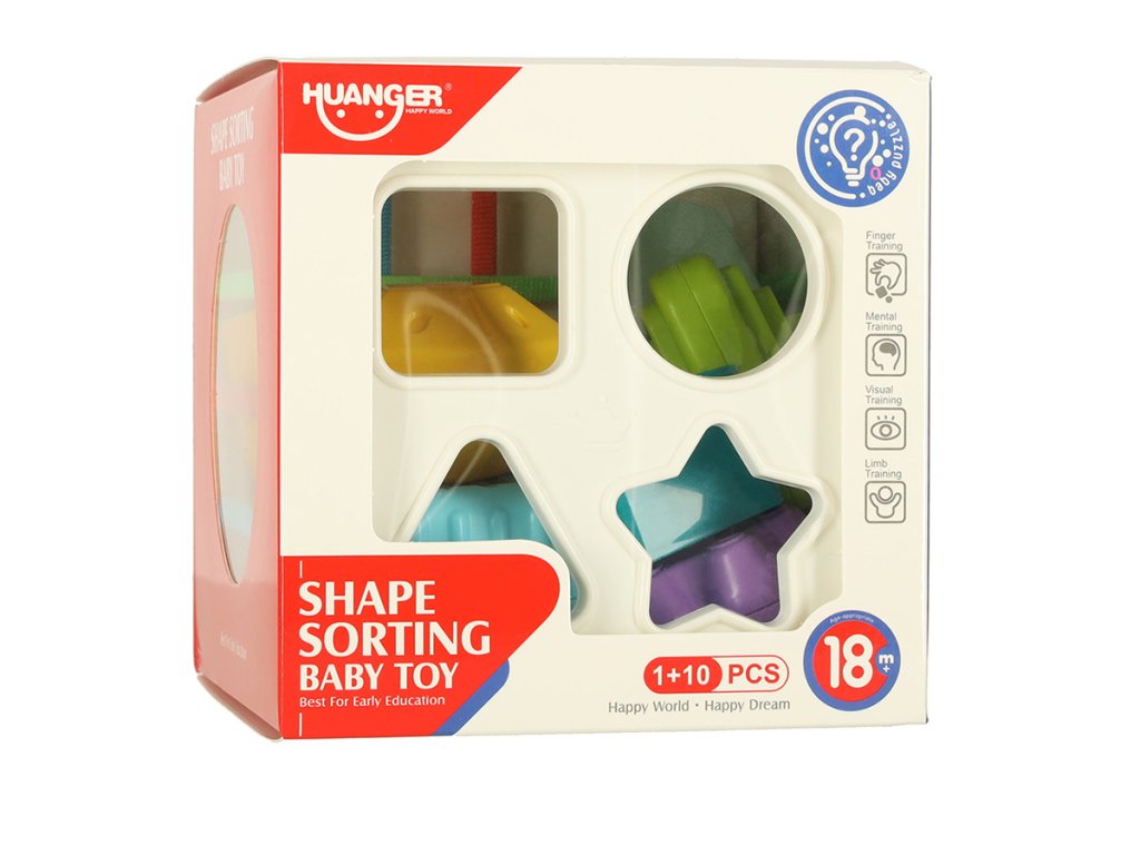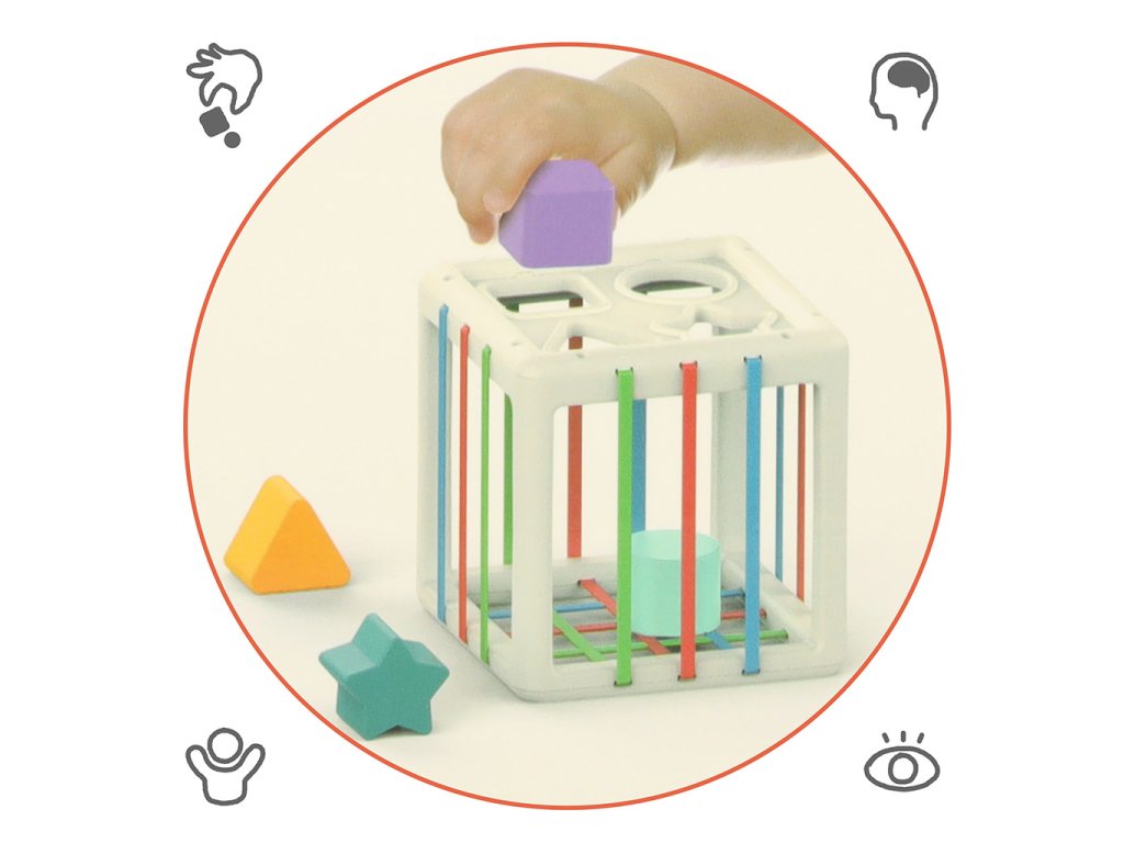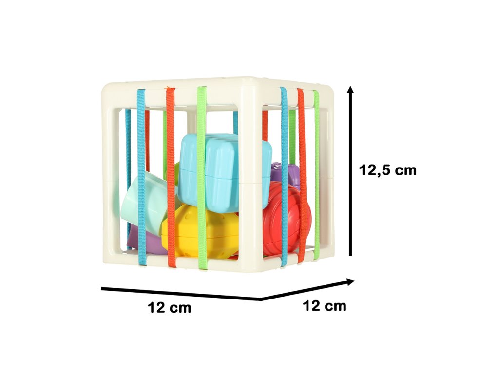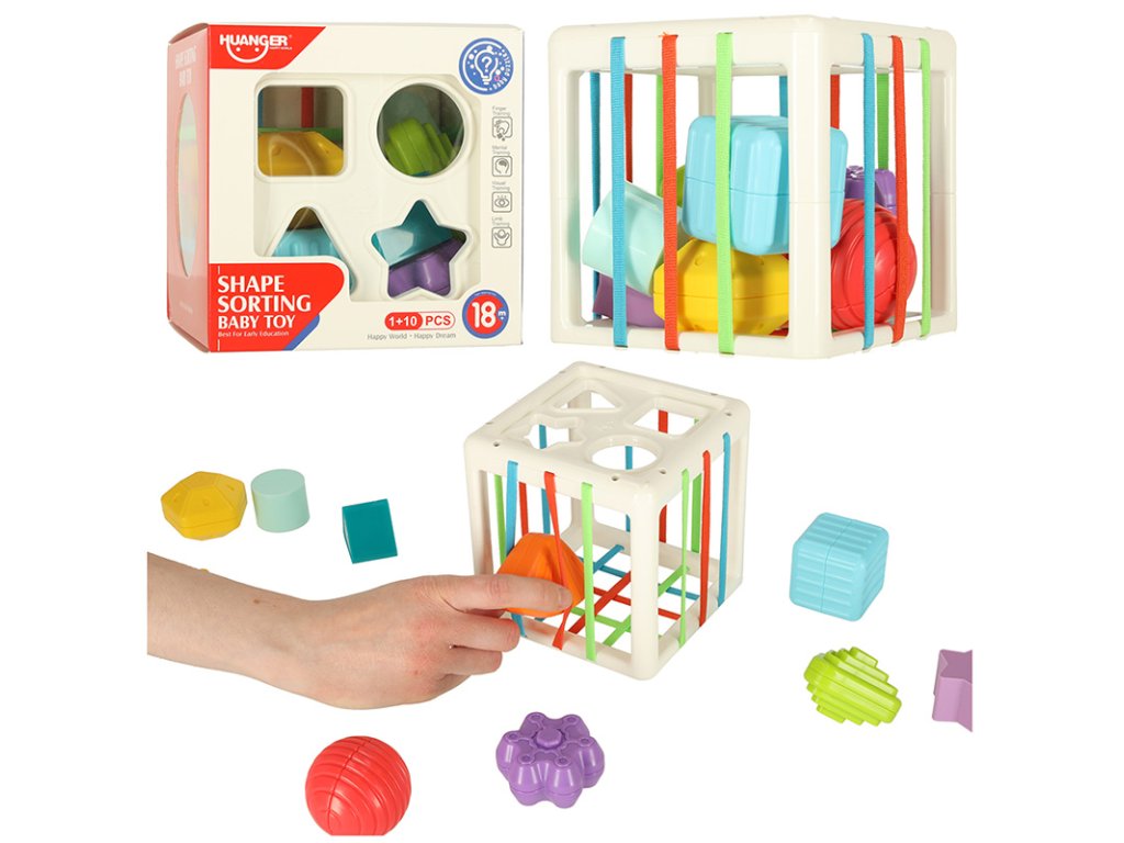 Hra s triedičkou je mimoriadne jednoduchá - batoľa musí vkladať farebné dieliky do kocky. Tento triedič je však trochu iný. Okrem bežných výrezov v tvare farebných doplnkov má aj steny s gumovými pásikmi, cez ktoré sa dajú kocky tiež pretláčať!