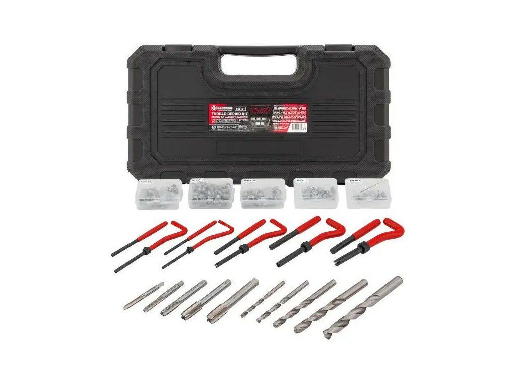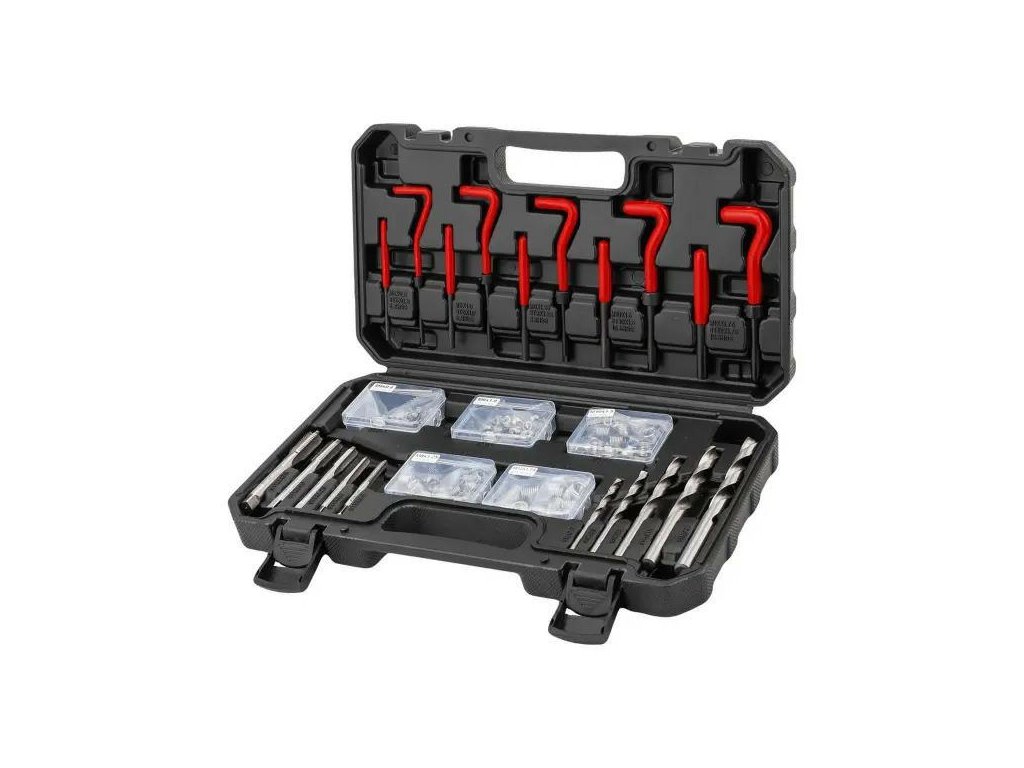 Profesionálna sada na regeneráciu a opravy poškodených závitov M5–M12 – až 131 prvkov v pevnom dielenskom kufri. Set obsahuje všetko potrebné na účinné obnovovanie poškodených, opotrebovaných alebo korodovaných vnútorných závitov: závitníky, špirálové vložky, vrtáky, montážne nástroje a vyťahovače. Nenahraditeľné riešenie v každej automobilovej dielni, mechanickej prevádzke, zámočníctve a priemyselných a opravárenských použití.