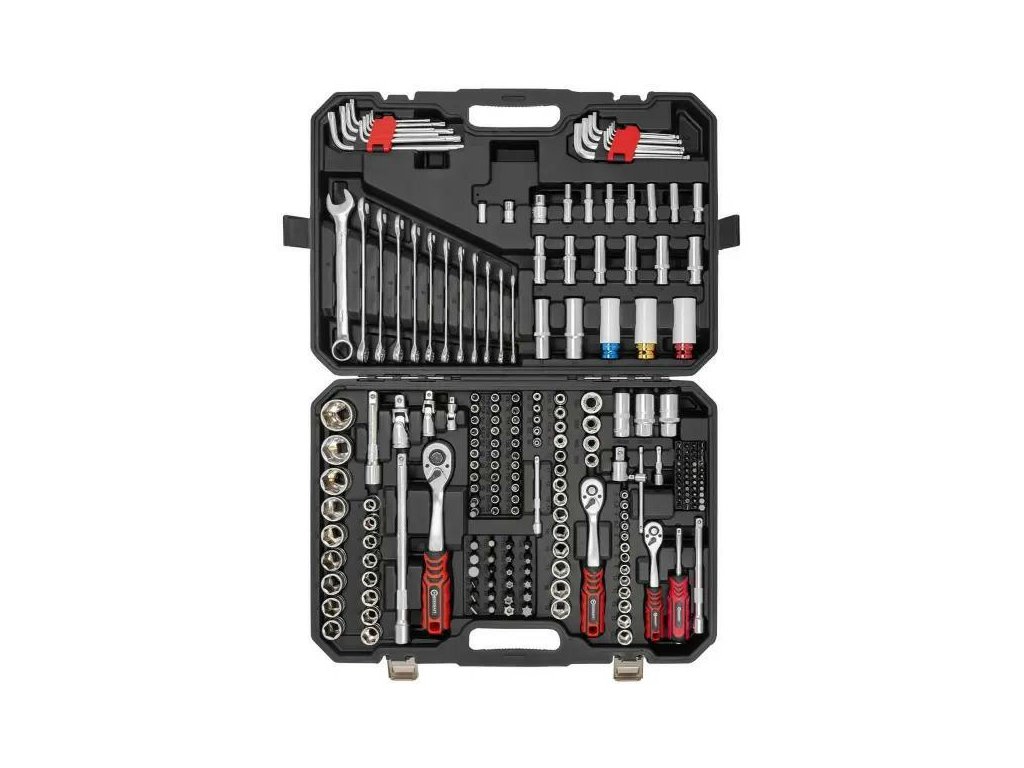 Sada obsahuje široký výber šesťhranných nástavcov (4–32 mm), predĺžení, račien, kĺbov, bitov, kľúčov, adaptérov a iného príslušenstva, čo umožňuje uskutočnenie takmer každej opravy. Zahŕňa rozmery v troch štandardoch – 1/4”, 3/8” a 1/2”, čím je univerzálny a kompatibilný s rôznymi nástrojmi.