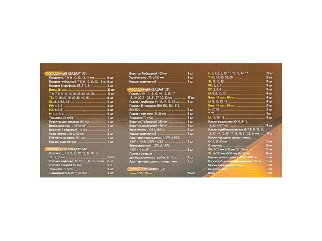 Všestranná sada náradia obsahujúca široký výber hlavíc, bitov a príslušenstva v štandardoch 1/4", 3/8" a 1/2". Vynikajúca ako pre profesionálne autoservisy, tak aj pre domáce dielne každého kutila. Vďaka prítomnosti šesťhranných, dvanásťhranných, E-profil a TORX koncoviek umožňuje pracovať s takmer všetkými populárnymi typmi skrutiek a matíc.