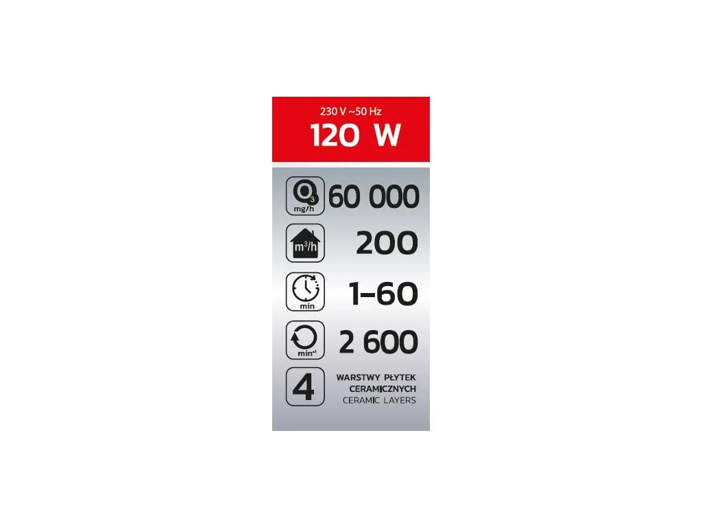 Pevná, trvalá konštrukcia ozonátora zaisťuje dlhodobé používanie prístroja. Dva režimy činnosti (nepretržitý alebo s časovačom) umožňujú efektívnu ozonizáciu vzduchu, čo umožňuje prispôsobiť fungovanie zariadenia individuálnym potrebám používateľa a podmienkam v miestnosti. Štyri vrstvy keramických platničiek generujúcich ozón zaisťujú zvýšenú účinnosť činnosti, čo sa premieta do efektívnejšej produkcie ozónu.