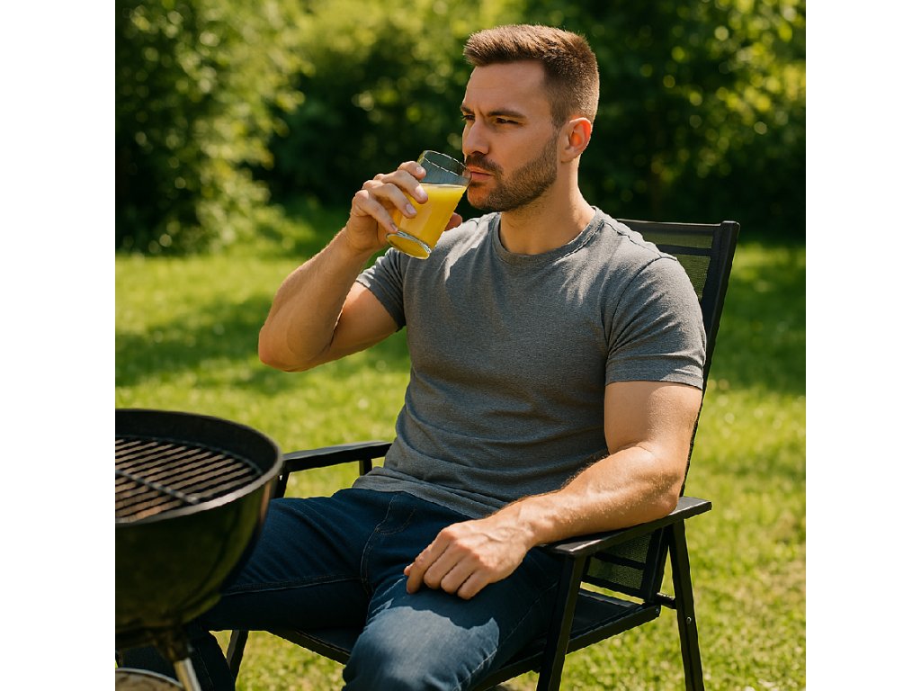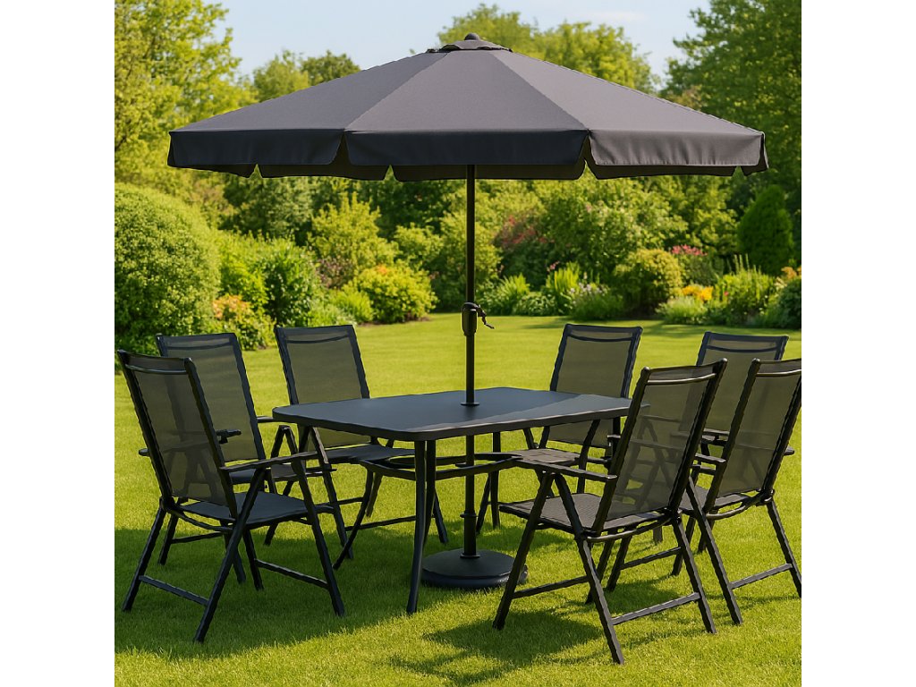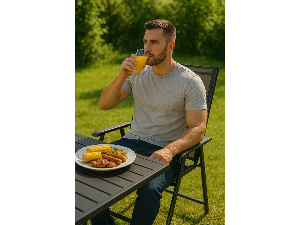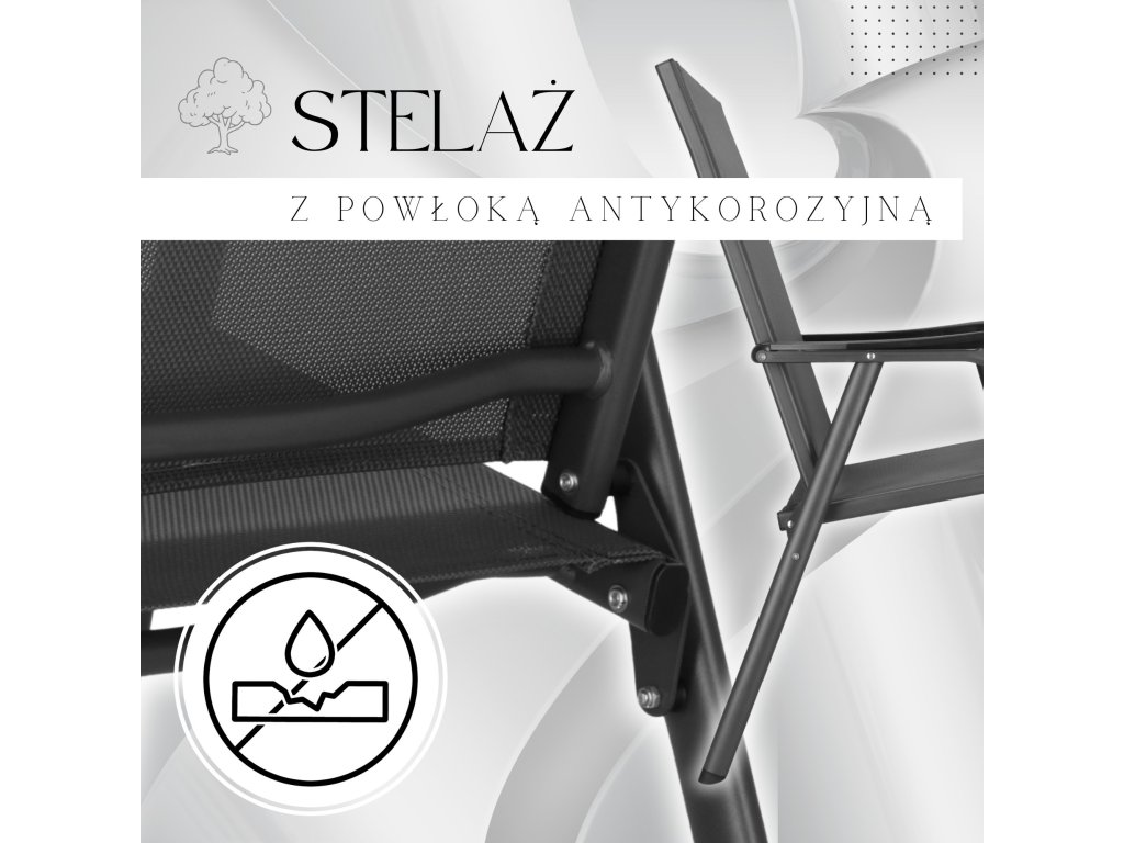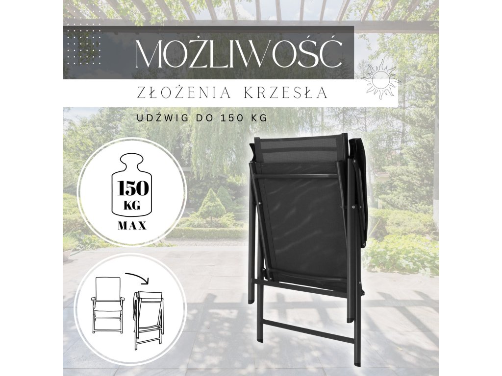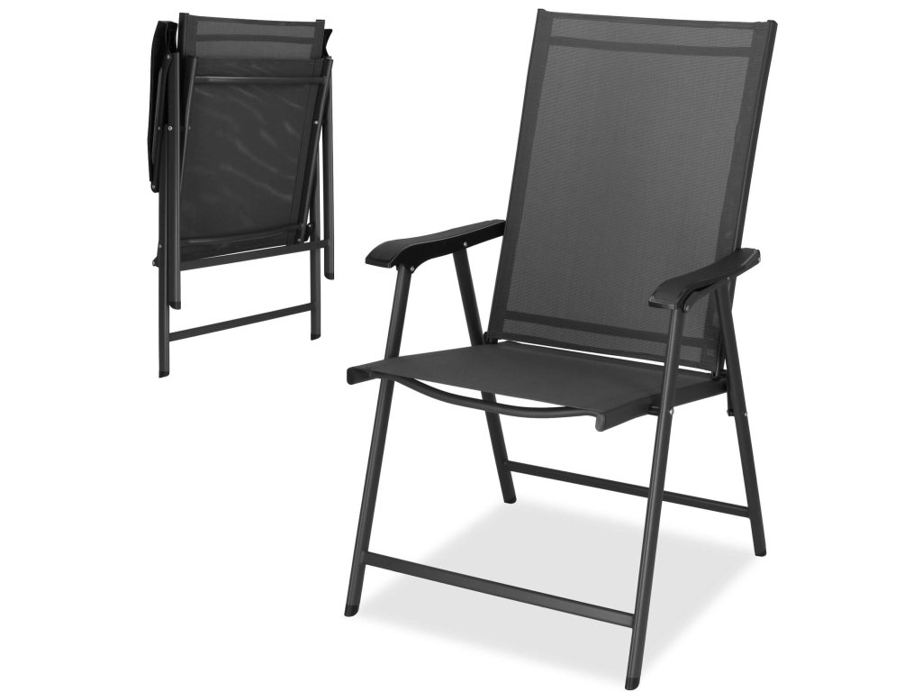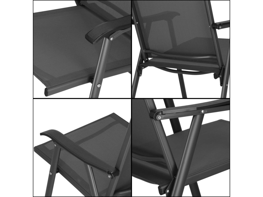 - Materiál: kov (konštrukcia); 100% textilene; plast (podrúčky)