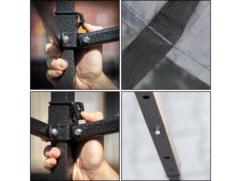 - Montáž strechy a stien pomocou suchého zipsu a viazaných šnúrok