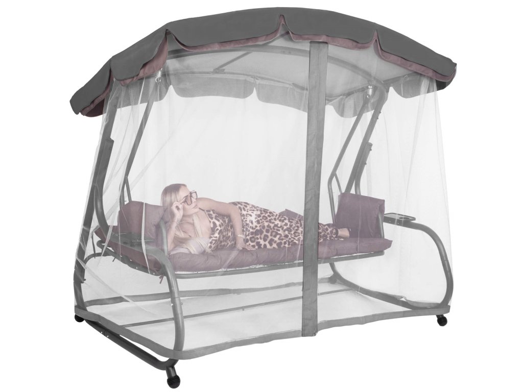 - Sieť proti komárom upevnená pomocou pásikov na konštrukciu strechy po celom jej obvode, má jeden vertikálny zips umožňujúci otváranie a zatváranie pripevnenej siete