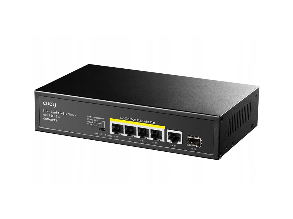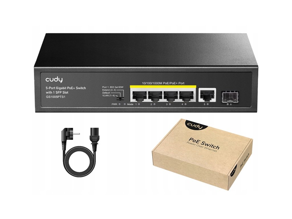 Switch GS1005PTS1 marka Cudy je pokročilý sieťový prepínač typu PoE. Zariadenie má 4 porty RJ45 10/100/1000Mbps s podporou napájacej technológie PoE v štandarde IEEE 802.3at / 802.3af, 1 port RJ45 1000Mbps a 1 port SFP. Napájací rozpočet PoE zariadenia je 120W pre celý switch a do 30W pre jeden port. Tento model sa vyznačuje vysokou priepustnosťou na úrovni 12 Gbps.
