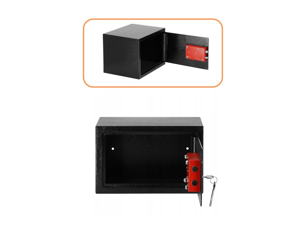 - Okrem toho: možnosť upevnenia na stenu a podlahu (hmoždinky v sade), plsťová podložka tlmiaca vnútro trezoru
