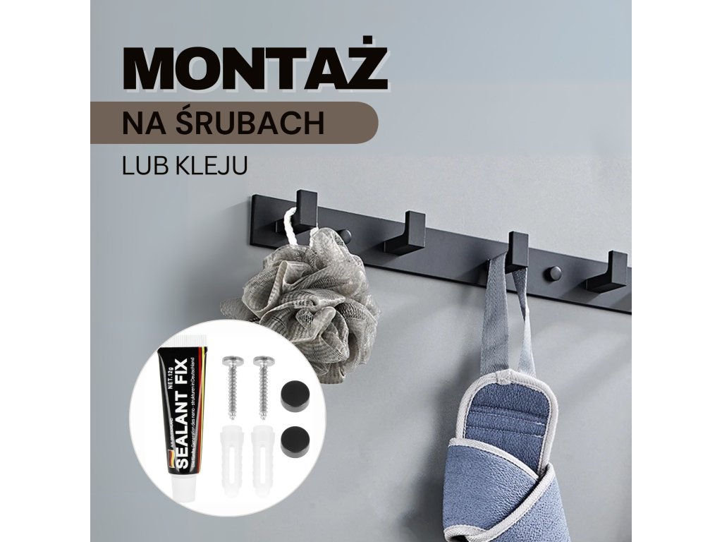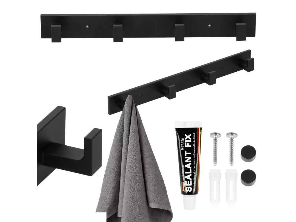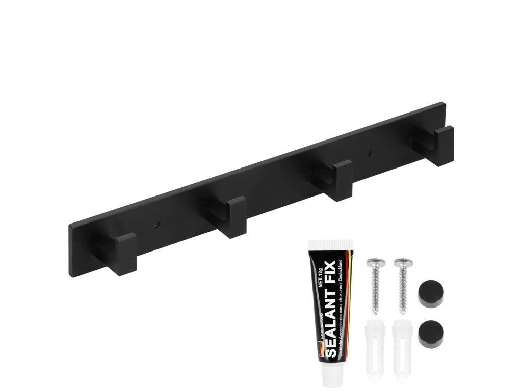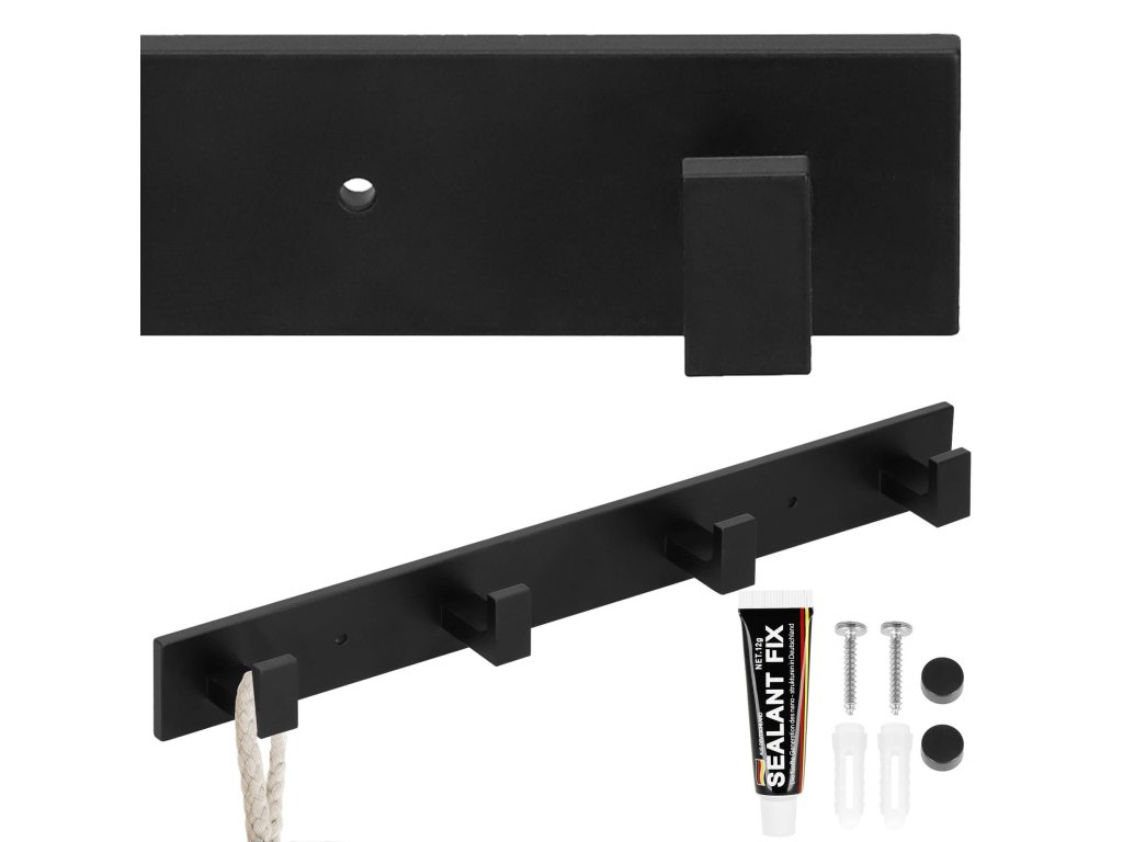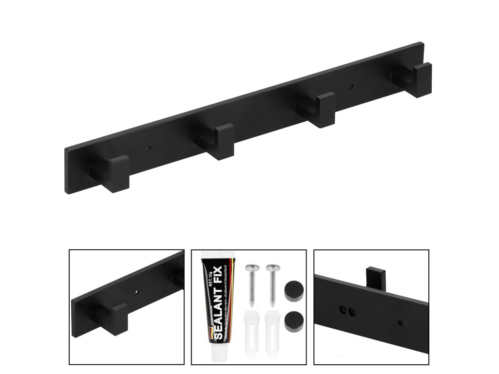 - Sada obsahuje: vešiak, lepidlo, 2 skrutky (dĺžka 28 mm), 2 čierne kryty, nálepky užitočné pri montáži na lepidlo