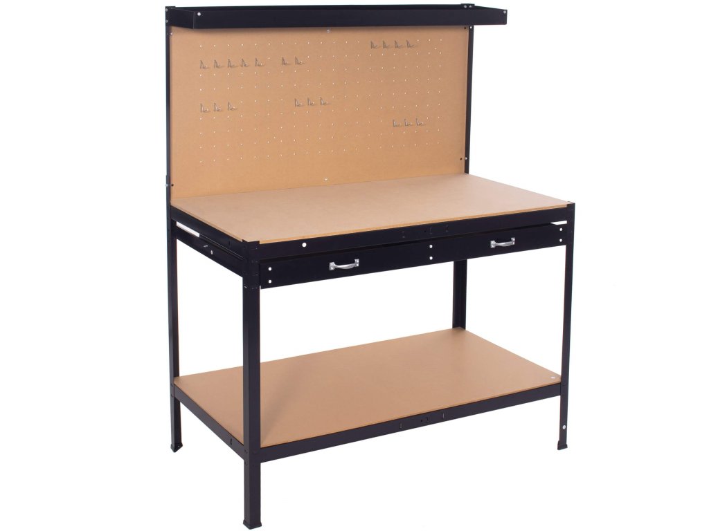 - Dielenský stôl vybavený nasledujúcimi prvkami: pracovná doska, zásuvka pod doskou, dolná polica, horná polica, stena s otvormi