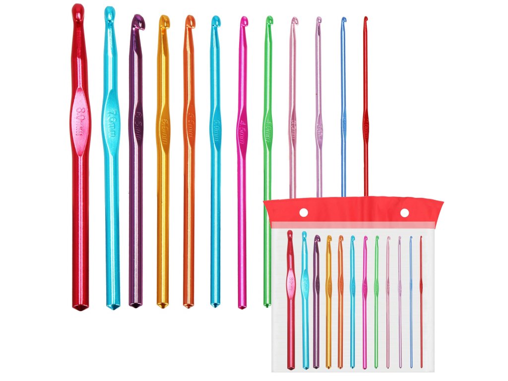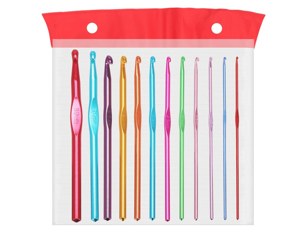 Súprava farebných háčikov v priehľadnom puzdre s priehradkami.