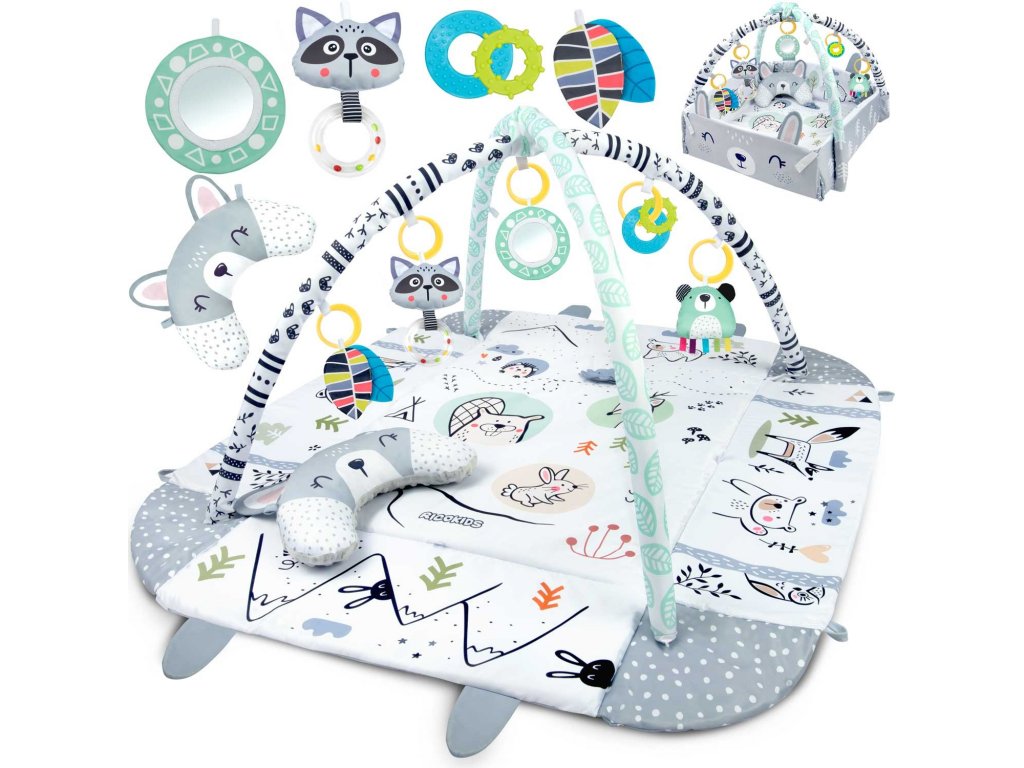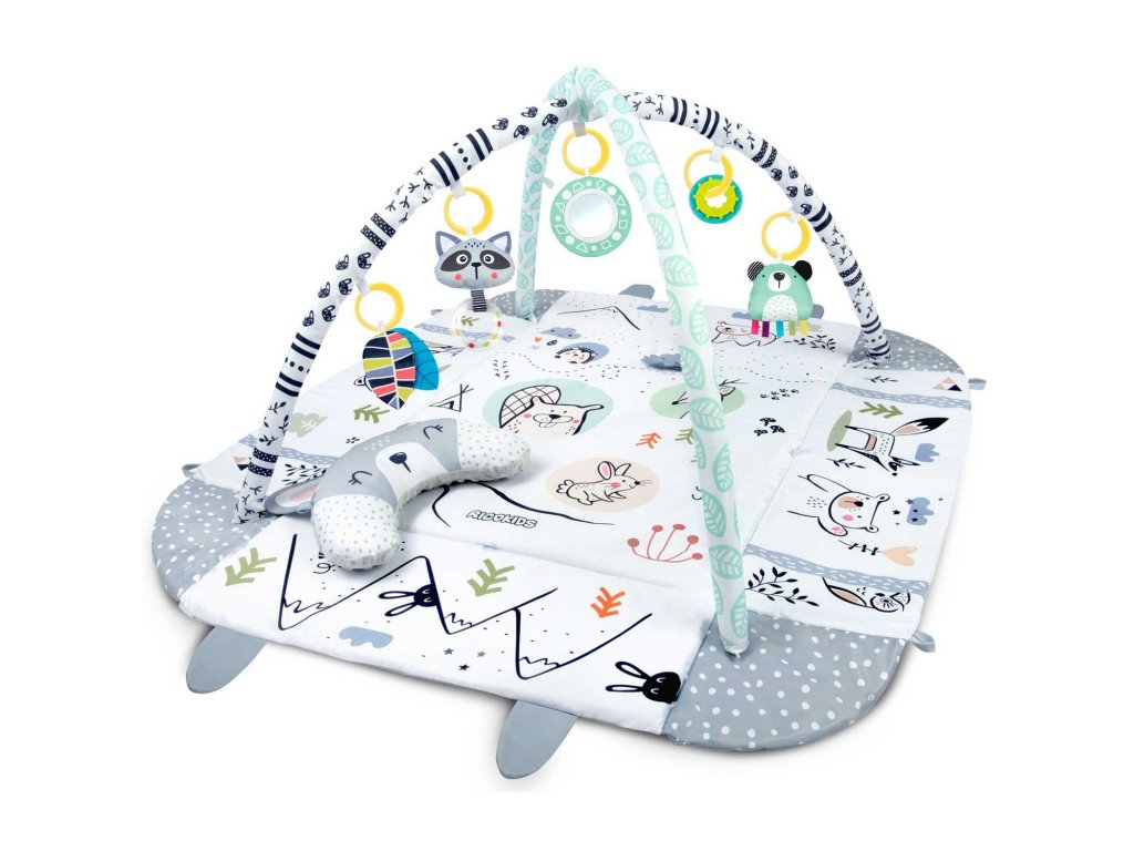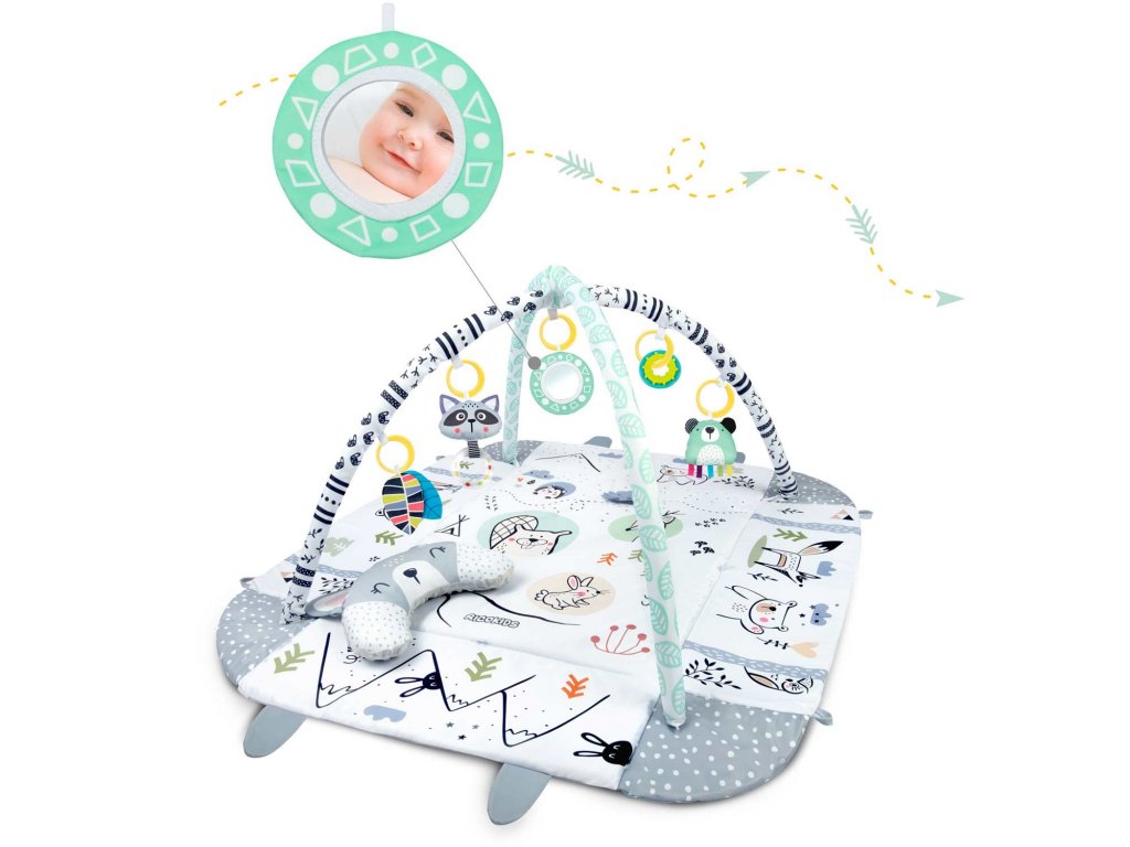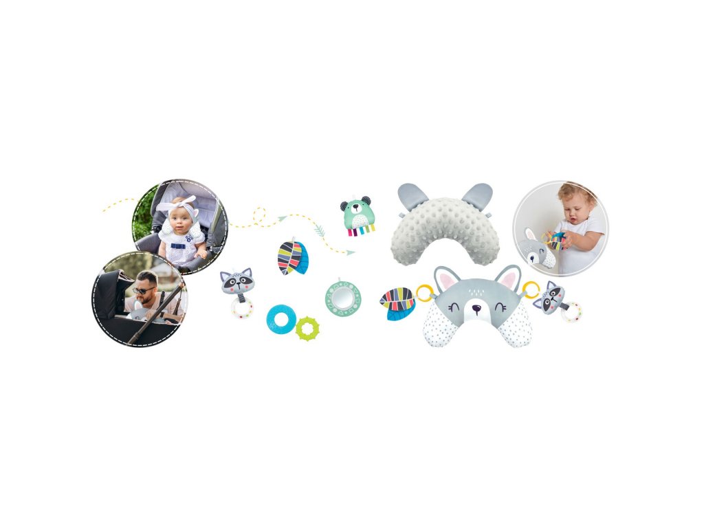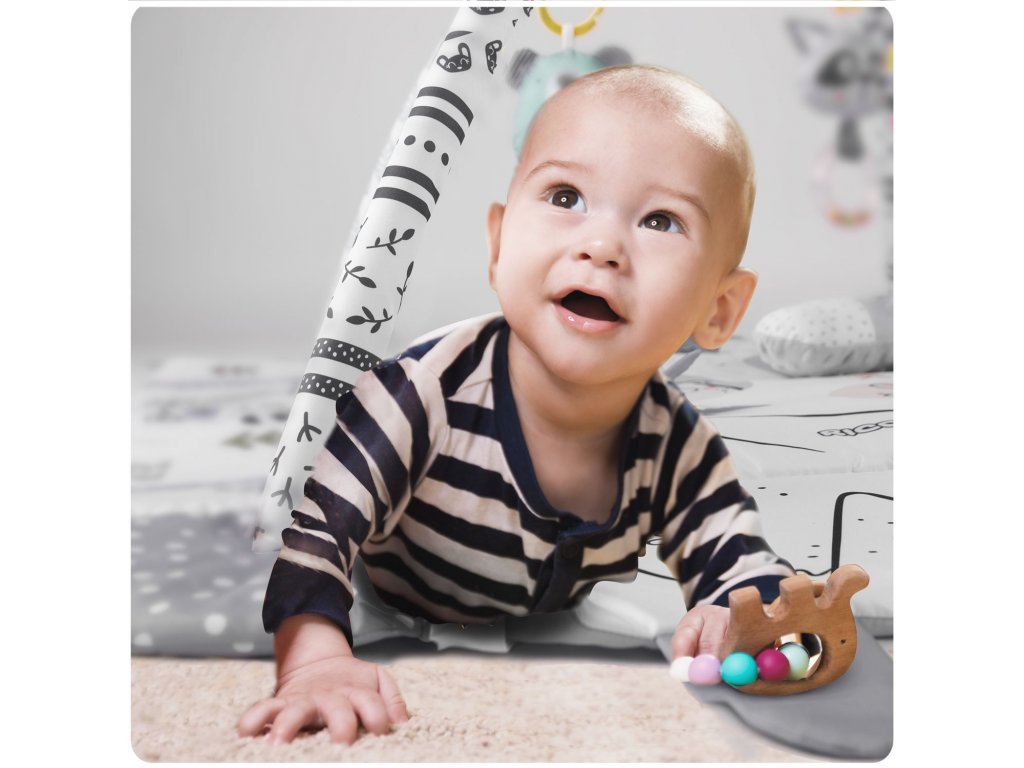 Preto sme k podložke pridali multifunkčné hračky, ktoré môžete zavesiť na oblúky - nech niečo hrká a niečo šuští! Hračky dokonca obsahujú pískaciu hračku - medvedíka so senzorickými stužkami!