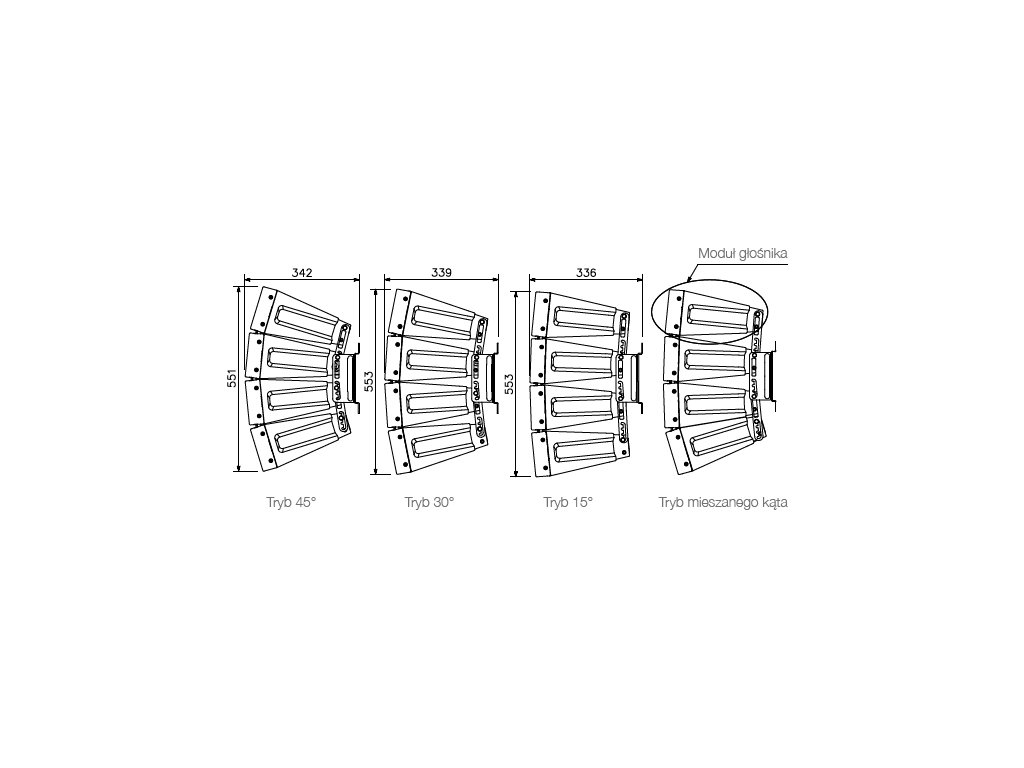 - Efektivita (1 W, 1 m): 96 dB (režim 60°), 97 dB (režim 45°), 98 dB (režim 30°), 99 dB (režim 15°)