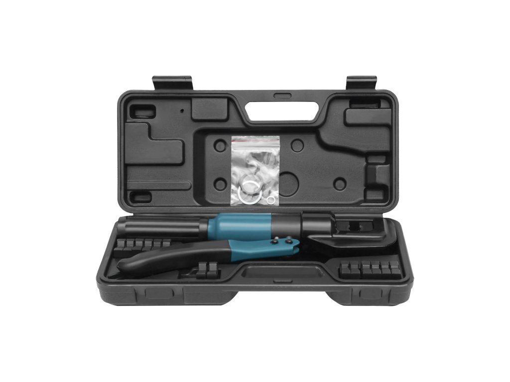 Ručná lisovačka s hydraulickým pohonom, určená na lisovanie káblových koncoviek vrátane hrubostenných Cu a Al. Pracovný rozsah: 4,0 - 70,0 mm2. Kameňe dostupné v súprave: 4, 6, 10, 16, 25, 35, 50, 70. 8 KALENÝCH MATRÍC. Technické údaje: Vysoká kvalita použitých materiálov zabezpečuje dlhú životnosť zariadenia, ##Ovládanie zariadenia jednou alebo oboma rukami, Vďaka jednochodovej hydraulike proces lisovania vyžaduje malú silu, Odolná konštrukcia, Vymeniteľné kalené matrice - 8 kusov, Prispôsobená na nepretržitú prevádzku v energetike, Lisovanie: šesťuholníkové, Nástrojová oceľ, kovaná, precízne dokončenie, Pracovný rozsah: 4,0 - 70,0 mm2, Sila: 60 kN/ 6T, Rukoväte pogumované. Plastový kufrík na lis a matrice. Dodatočná súprava 5 tesnení Dĺžka: 315 mm, Hmotnosť súpravy: 2,85 kg. Najvyššia kvalita použitých materiálov zabezpečuje dlhú životnosť zariadenia a bezporuchovú prevádzku. Praktický a pohodlný kufrík nachádzajúci sa v súprave poskytuje možnosť pohodlného prenášania a uskladnenia zariadenia. Praktické a pohodlné balenie na prenášanie chráni pred poškodením a stratou matríc. Hydraulická lisovačka by mala byť používaná v súlade s jej určením. Je potrebné sa vyhnúť náhodným úderom a taktiež dbať, aby počas uskladnenia nedochádzalo k nárazom s inými nástrojmi. Počas práce nie je vhodné príliš silno tlačiť rameno. Počas uskladnenia by mala byť vratná skrutka oleja uvoľnená. Ak nástroj nebude používaný dlhší čas, je potrebné ho dôkladne vyčistiť a povrch pokryť prostriedkom zabraňujúcim korózii. Nie je vhodné nástroj voľne demontovať, pretože má kompaktnú štruktúru. V prípade demontáže je potrebné dbať na čistotu miesta, aby sa predišlo prenikaniu prachu a nečistôt.Dodatočné parametre