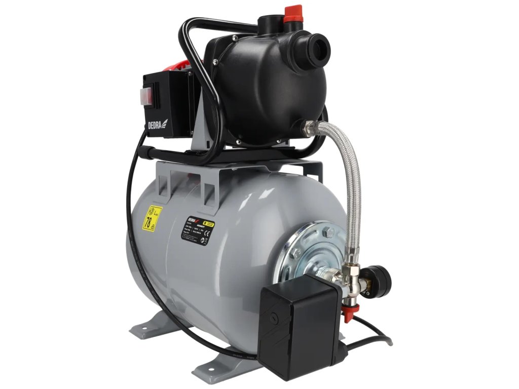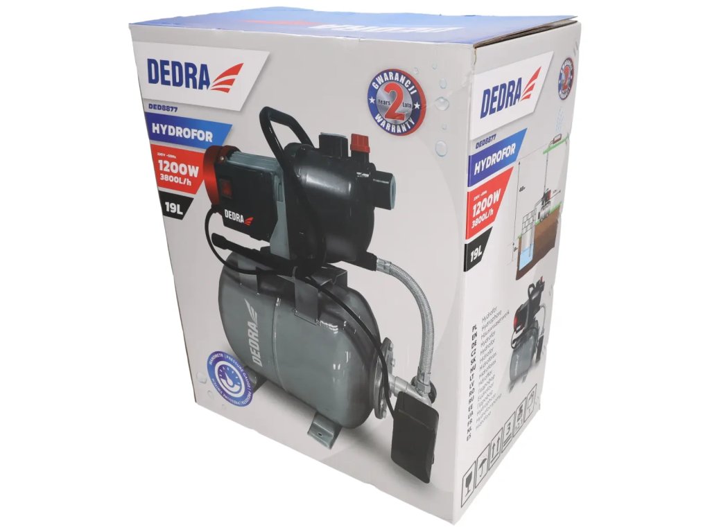 To je veľkým prínosom pre životné prostredie.Hydrofor DEDRA DED8877 je napájaný čerpadlom s výkonom 1200 W a napätím 230 V, t. j. zo štandardnej zásuvky. Hydrofor je vybavený integrovaným vodným čerpadlom s výkonom 3 800 litrov za hodinu,ktoré zabezpečuje konštantný a rovnomerný prietok vody. Telo hydrátora tvorí oceľová nádrž s objemom 19 litrov. Tlakový spínač jezodpovedný za udržiavanie tlaku vody v systéme (1,5-3 bar) tým, že v prípade potreby aktivuje vodné čerpadlo. Tlak možno sledovať pomocou zabudovaného manometra. Hydrofor je pripojený k vodnému čerpadlu pomocou 1,2 m kábla. Nohy na základni hydr oora s otvormi na pevnú povrchovú montáž.
