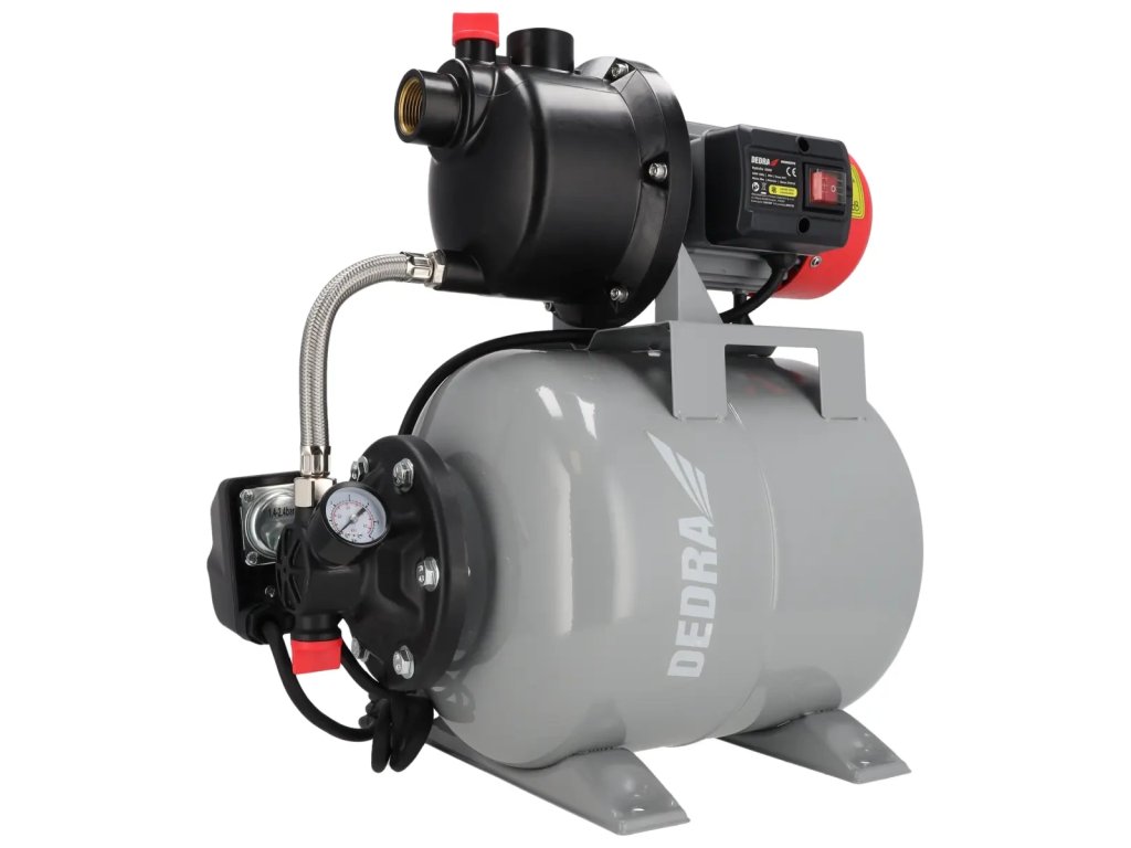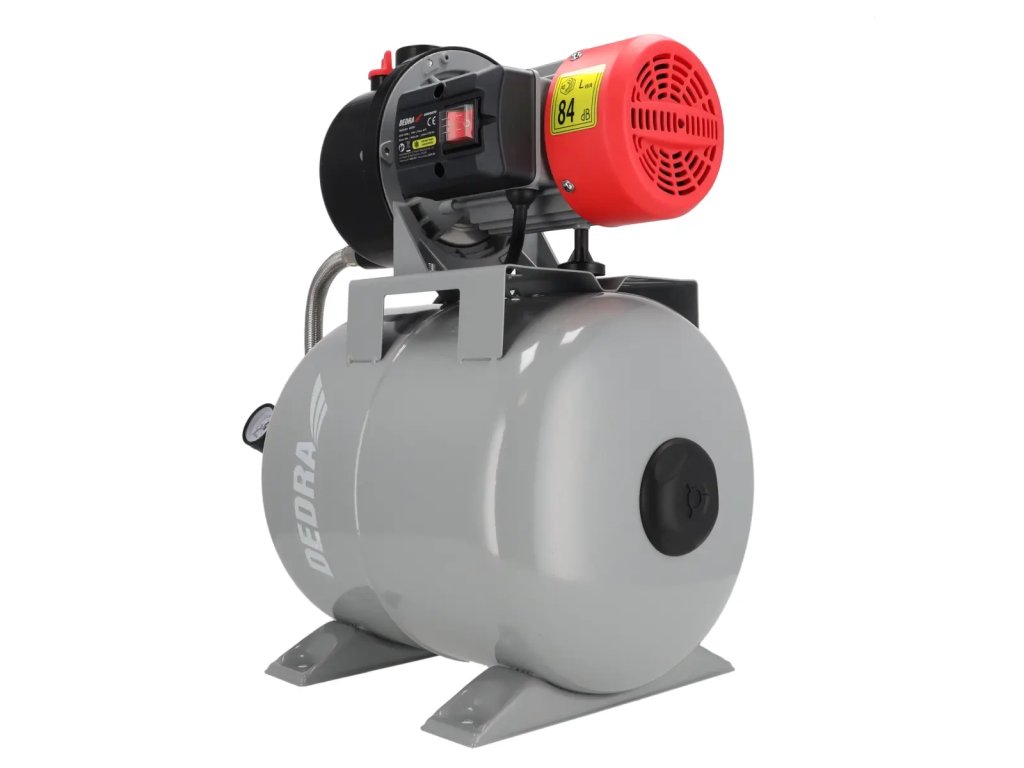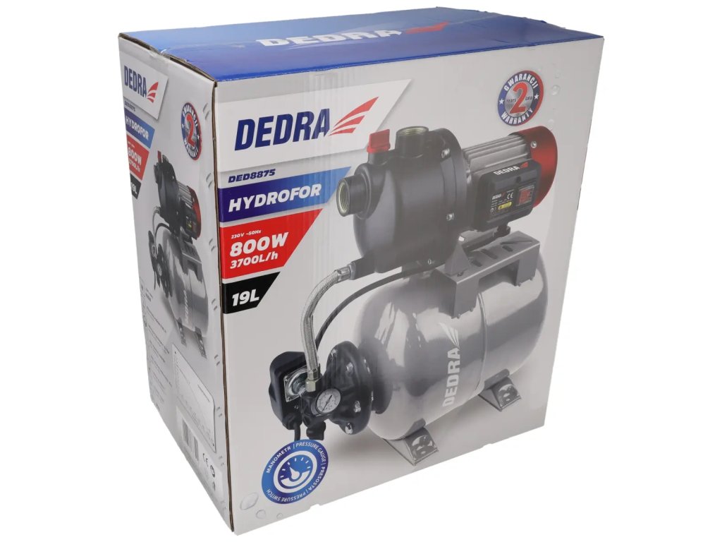 Čerpadlo nebeží tak často.Hydrofor DEDRA DED8875 je napájaný 800 W čerpadlom na 230 V, t. j. zo sieťovej zásuvky. Hydrofoil má integrované vodné čerpadlo s výkonom 3 700 litrov za hodinu, ktoré zabezpečuje konštantný a rovnomerný tlak vody. Telo hydr oora je oceľová nádrž s objemom 19 litrov. Tlakový spínač je zodpovedný za udržiavanie tlaku vody v systéme (1,5-3 bar) a v prípade potreby aktivuje vodné čerpadlo. Tlaks a monitoruje pomocou zabudovaného manometra. Hydrofor s vodným čerpadlom je napájaný 1,2 m dlhým káblom. Nohy tvoria základňu hydroforu s otvormi, ktoré umožňujú trvalé upevnenie na povrch.