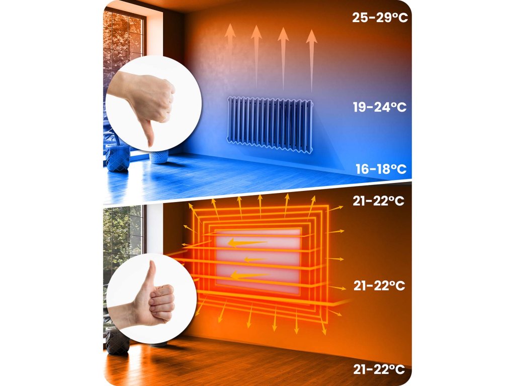 Rýchle zahrievanie – panel funguje okamžite, šetriac čas a energiu, na rozdiel od tradičných radiátorov, ktoré dlho ohrievajú vzduch.