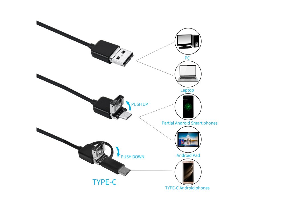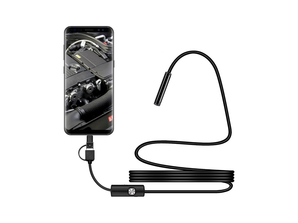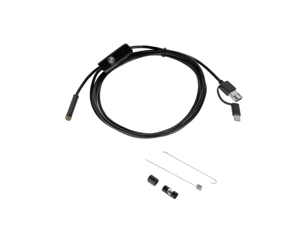 V sade: kamera, koncovky (hák, magnet, bočné zrkadlo), návod na použitie