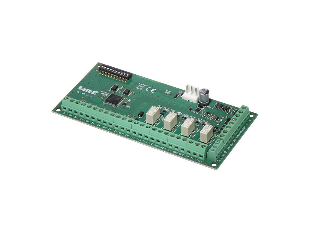 INT-PP je modul umožňujúci rozšírenie systému o 8 programovateľných drôtových vstupov a 8 programovateľných výstupov (4 reléové a 4 typu OC). Zariadenie spolupracuje s ústredňami alarmov