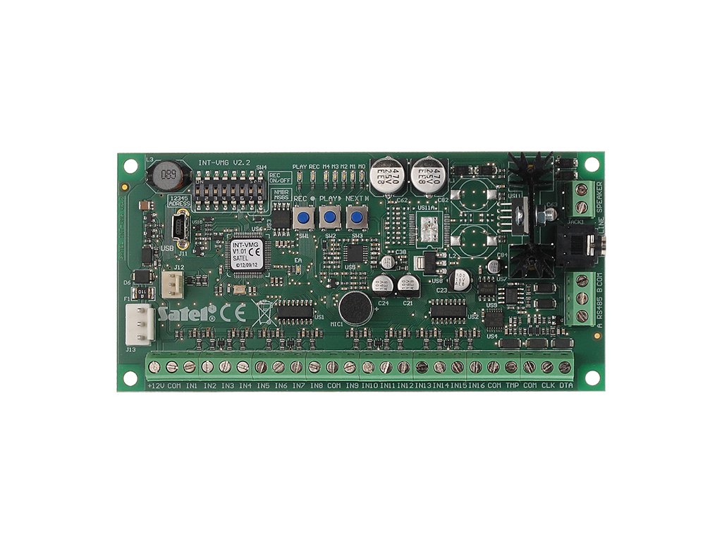 INT-VMG je modul určený na prehrávanie hlasových správ v objekte, ktoré sú spúšťané pomocou ústredne alarmu. Zariadenie môže byť použité na doručovanie informačných alebo výstražných správ. Modul je vybavený vstavaným zosilňovačom umožňujúcim pripojenie externého reproduktora, zatiaľ čo linkový výstup umožňuje pripojiť hlasový modul INT-VMG k PA systému objektu. Správy sú zaznamenávané do pamäte modulu pomocou softvéru vybaveného funkciou prevodu písaného textu na reč. Pamäť zariadenia môže uchovávať až 32 hlasových správ s celkovou dĺžkou viac ako 17 minút. INT-VMG spolupracuje s ústredňami alarmov