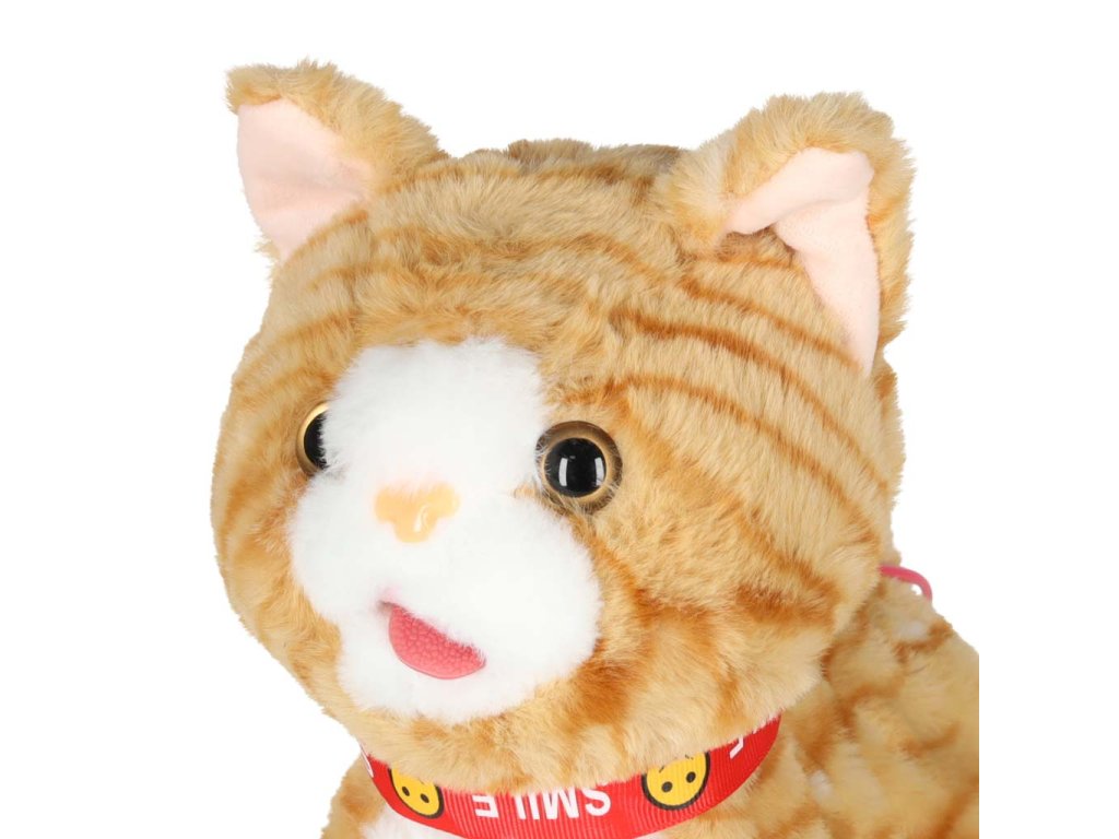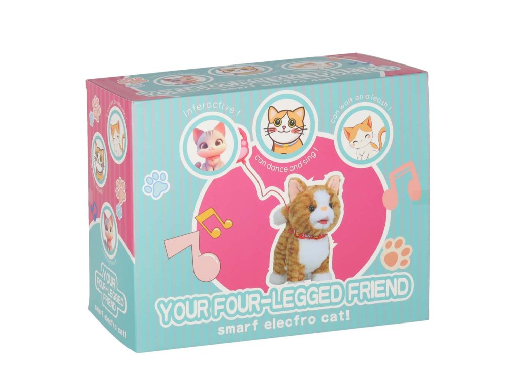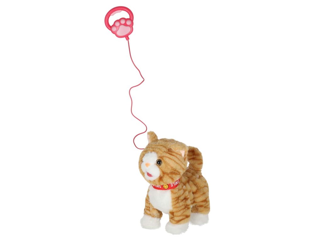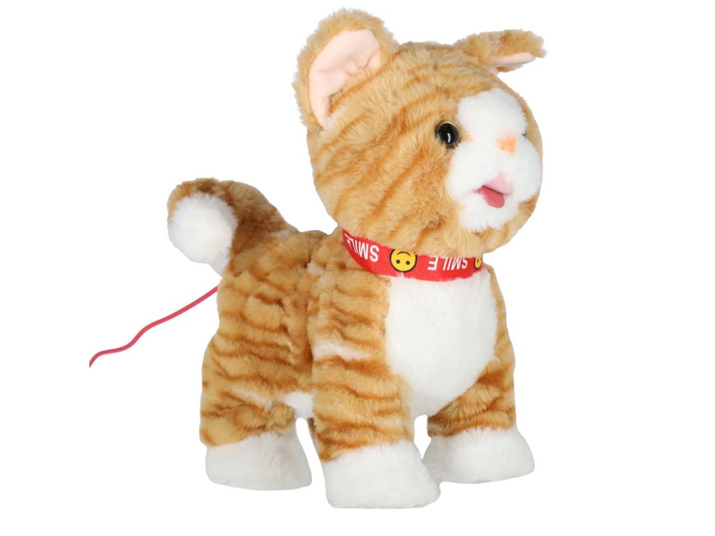 Mačka chodí a zároveň hrá pesničky - keď stlačíte tlačidlo na vodítku, mačka chodí dopredu a hrá pesničky v angličtine