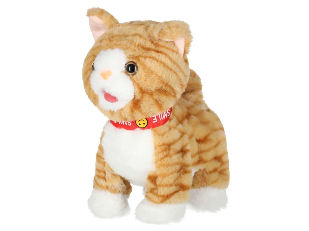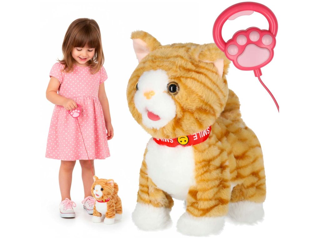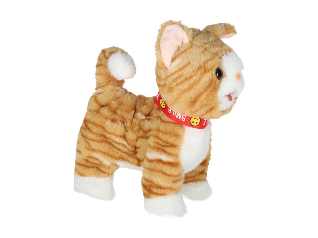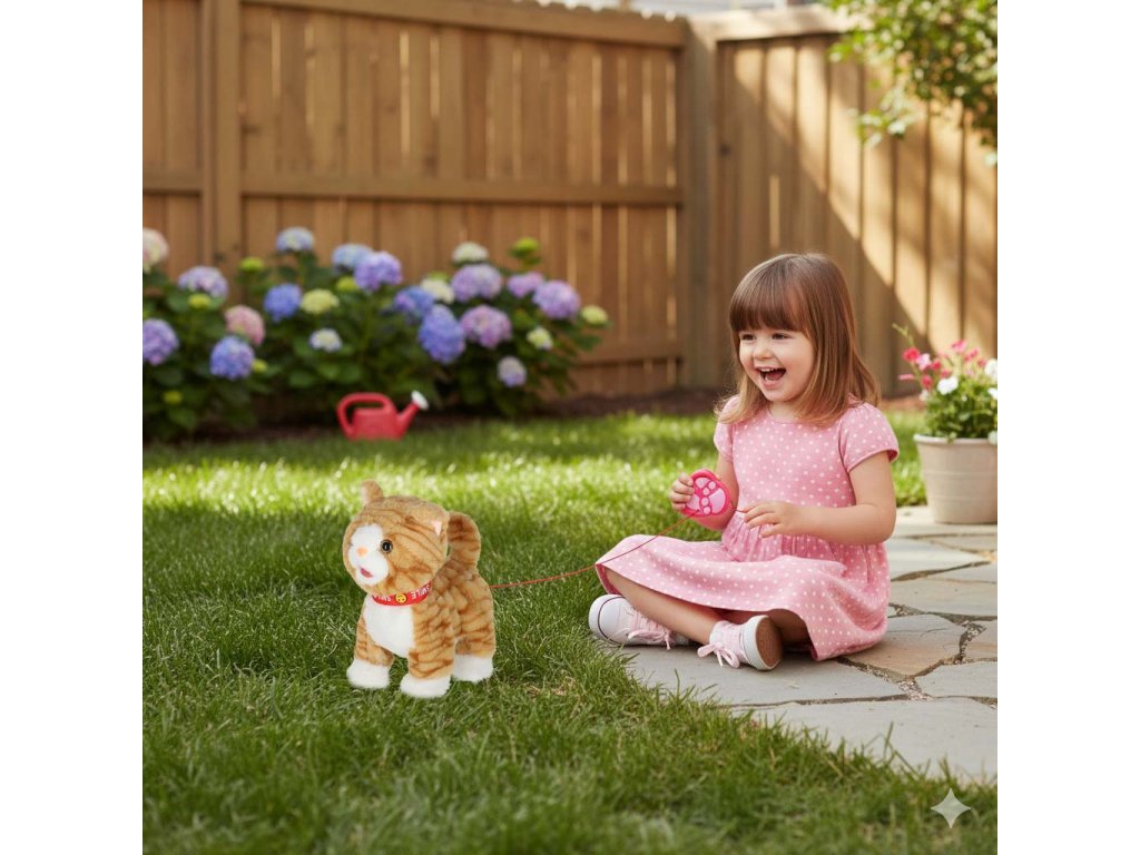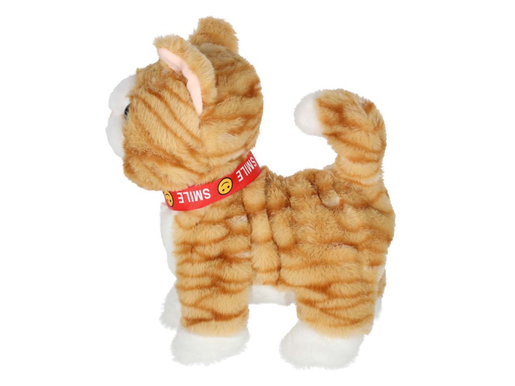 Mačka chodí a zároveň hrá pesničky - keď stlačíte tlačidlo na vodítku, mačka chodí dopredu a hrá pesničky v angličtine
