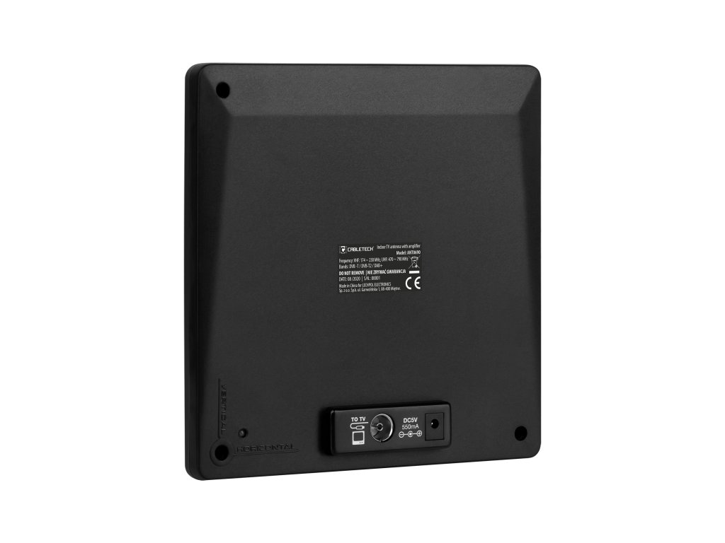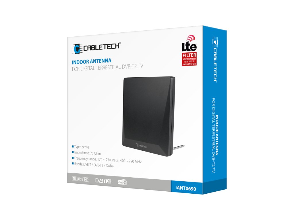 Vnútorná anténa Cabletech poskytuje ideálny príjem digitálnych televíznych signálov DVB-T2 a analógových televíznych signálov v pásmach VHF a UHF. Podpora pásma VHF umožňuje anténe Cabletech prijímať digitálne pozemné televízne kanály, umiestnené na multiplexe MUX 8. Filter LTE použitý v tomto modeli eliminuje rušenie siete LTE, ktoré ovplyvňuje kvalitu pozemného televízneho signálu. Model ANT0690 umožňuje nielen príjem televízneho signálu, ale aj digitálneho rozhlasu DAB. Na zabezpečenie najlepšieho príjmu signálu bola izbová anténa Cabletech prispôsobená na horizontálnu aj vertikálnu prevádzku. Minimalistický, ale štýlový dizajn antény znamená, že zariadenie nebude narúšať estetiku interiéru. Naopak, vďaka čiernej farbe zariadenia vyzerá skvele v obývačke, kuchyni alebo kancelárii.