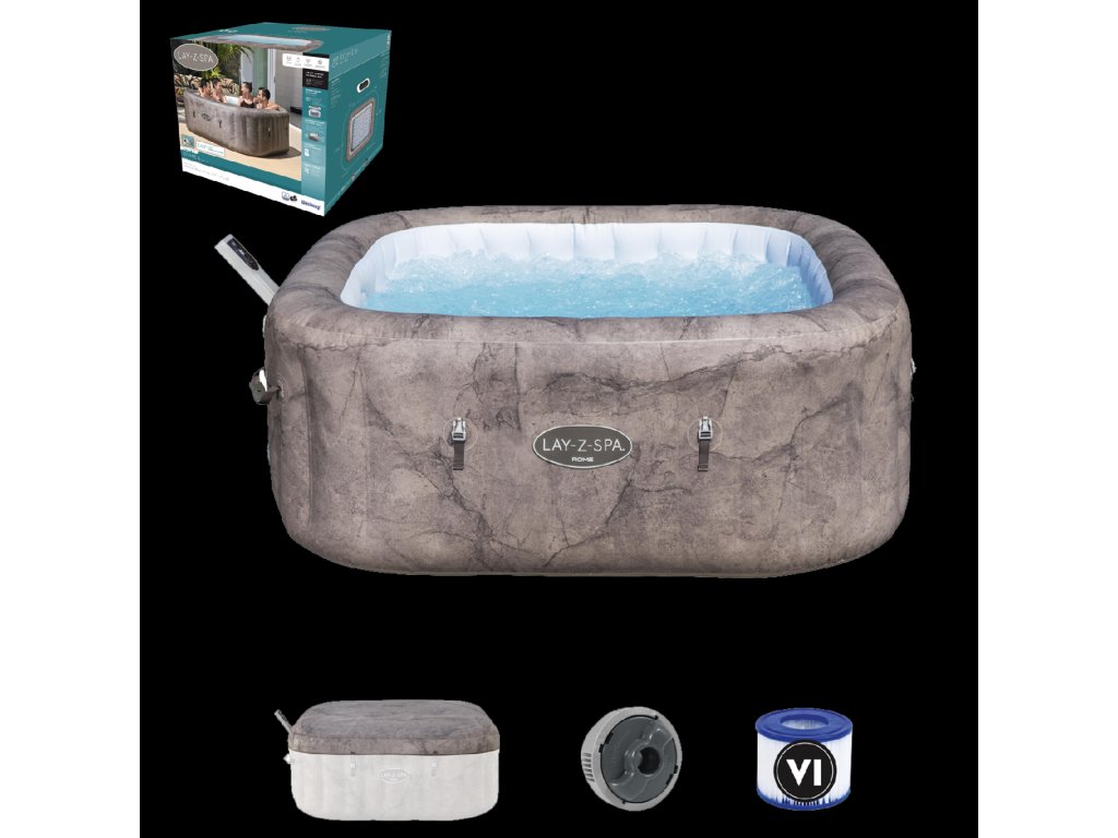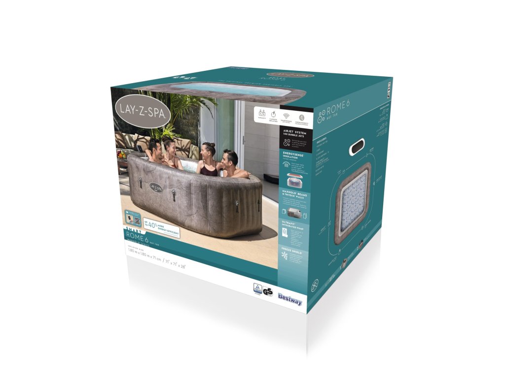 Vírivka Lay-Z-Spa Rome AirJet je výbornou voľbou do záhrady pre 4-6 osôb. Vďaka technológii AirJet™ a 180 tryskám poskytuje výnimočnú masáž bublinkami, ktorá garantuje pohodlný relax. Rozmery po nafúknutí sú 180 cm x 180 cm x 71 cm, s vnútornými rozmermi 130 cm x 130 cm. Systém ohrievania umožňuje rýchle zvýšenie teploty vody a maximálna teplota ohrievania je 40°C, čo zaisťuje pohodlné používanie počas celého obdobia.