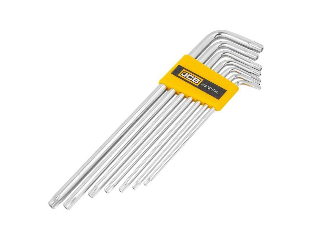Sada 7 extra dlhých TORX kľúčov s otvorom (bezpečné TORX, typ H/TN) značky JCB sú nepostrádateľné nástroje pre prácu s elementmi zabezpečenými skrutkami s ochranou proti manipulácii. Vďaka prítomnosti otvoru v drieku (v strede hrotu), kľúče umožňujú zaskrutkovávanie a vyskrutkovávanie špeciálnych bezpečnostných skrutiek, využívaných napr. v elektronike, poplachových systémoch, priemyselnej automatike, servise domácich spotrebičov a elektroniky alebo vozidlách.