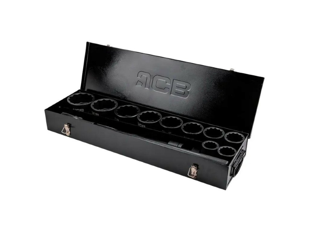 Profesionálna sada rázových nadstavcov JCB s pohonom 1" je ideálny nástroj na prácu s najväčšími krútiacimi momentmi. Vďaka 12-hrannému profilu nadstavce poskytujú vynikajúci úchop aj v prípade mierne zaoblených hrán skrutiek, čo zvyšuje bezpečnosť a komfort používania.