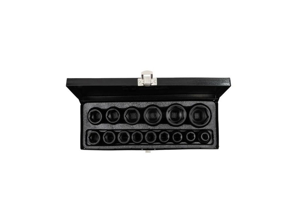 Nástavce majú šesťhranný profil, ktorý zaisťuje pevné prispôsobenie k skrutkám a maticiam a bezpečný prenos vysokých krútiacich momentov bez rizika šmyku. Všetko je umiestnené v pevnom, kovovom kufri, ktorý uľahčuje skladovanie a prenášanie.