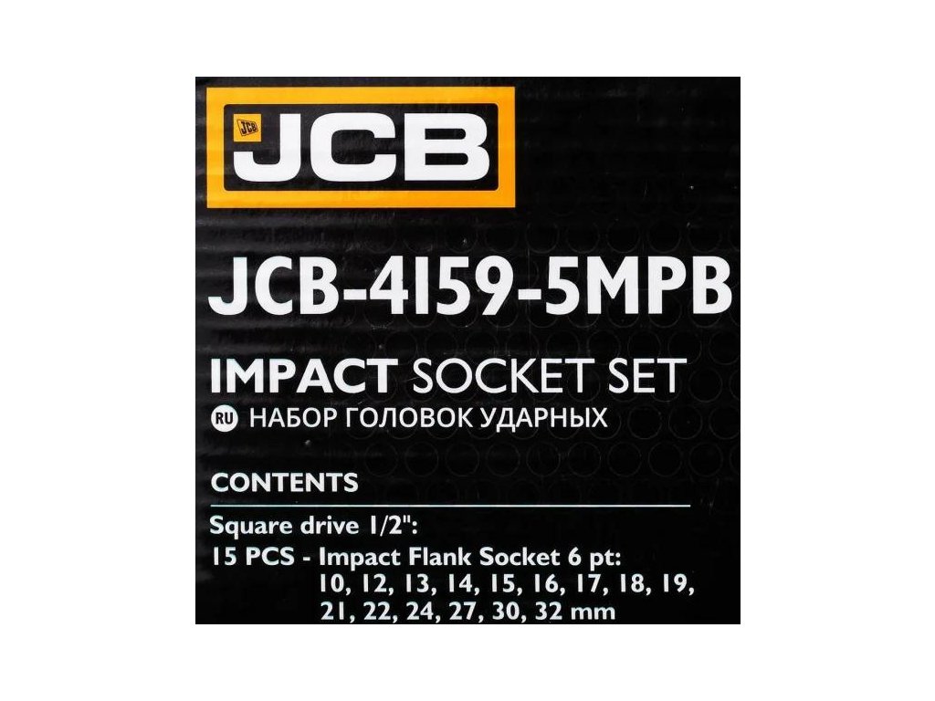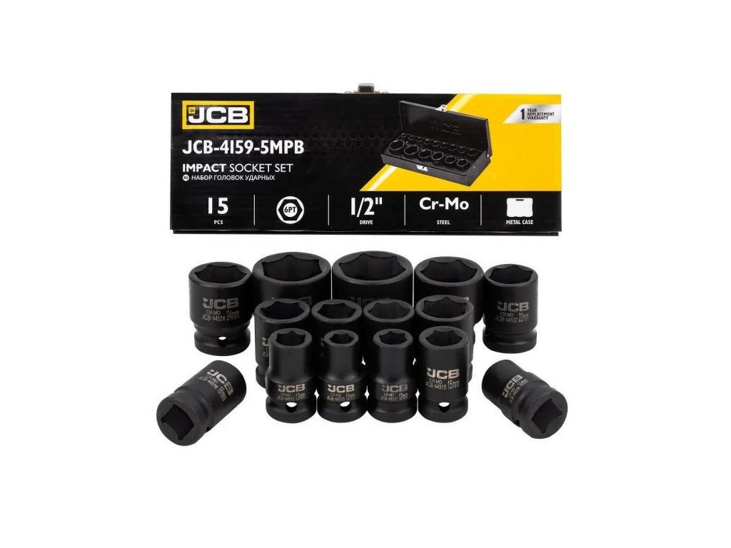 JCB-4159-5MPB je kompletná sada 15 rázových nástavcov určených pre najnáročnejšie úlohy v dielňach, autoservisoch a pri montážnych prácach. Vyrobené z vysokopevnostnej ocele Cr-Mo (chróm-molybdénovej), nástavce ponúkajú výnimočnú odolnosť proti lámaniu, úderom a deformáciám, aj pri práci s pneumatickými alebo elektrickými kľúčmi.