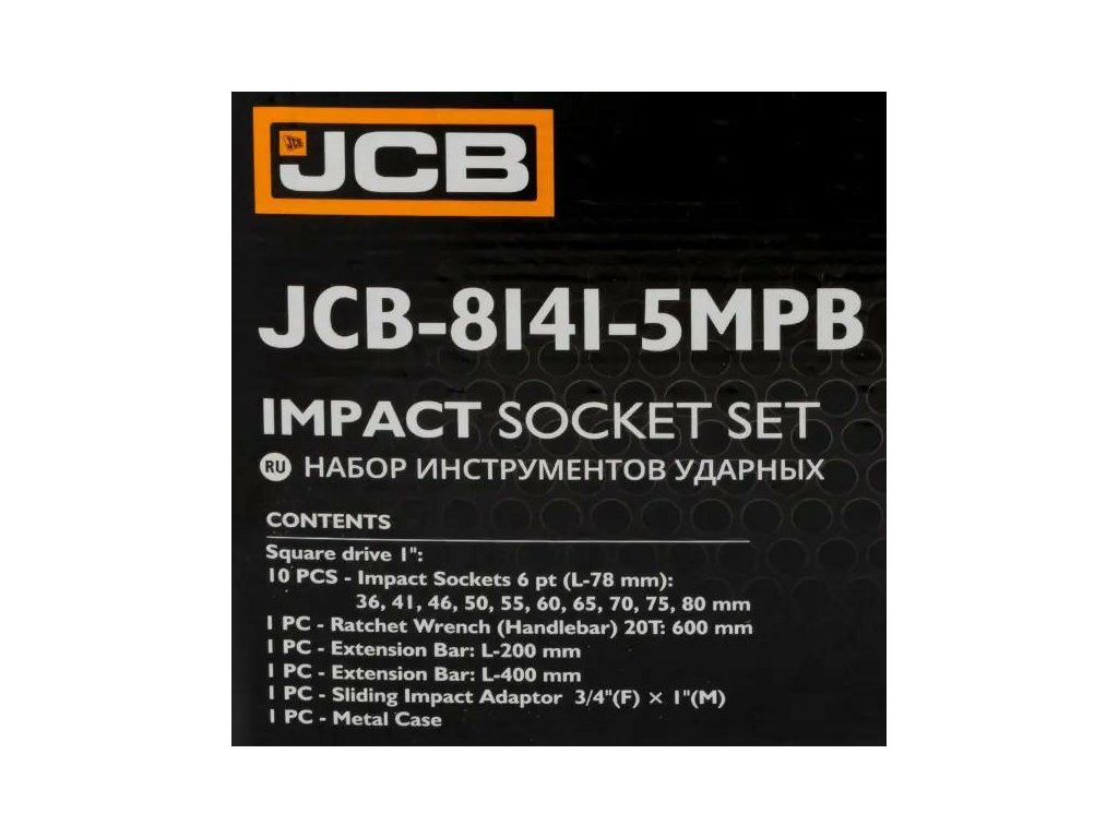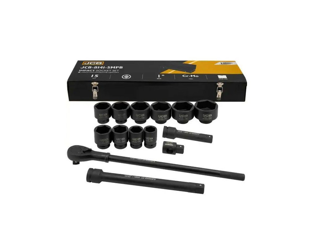 Sada rázových nástrojov JCB JCB-8141-5MPB je kompletná, profesionálna sada pre náročné servisné a priemyselné práce. Skladá sa z 10 rázových šesťhranných hlavíc 1” a príslušenstva umožňujúceho komfortnú a bezpečnú prácu so spojovacími prvkami s vysokým krútiacim momentom. Určená na údržbu priemyselných strojov, nákladných vozidiel, poľnohospodárskych zariadení a oceľových konštrukcií.