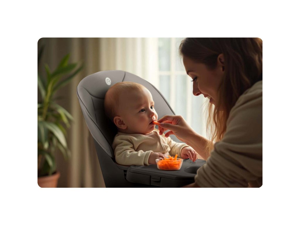 Podpora správneho držania tela: starostlivo navrhnutá stolička pomáha udržať správne držanie tela počas jedenia aj hry.