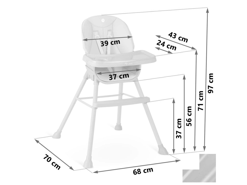 Stolička umožňuje voľné nastavenie vzdialenosti podnosu od dieťaťa. Môžete ho tiež kedykoľvek úplne demontovať.