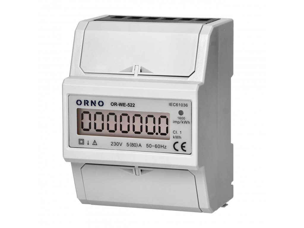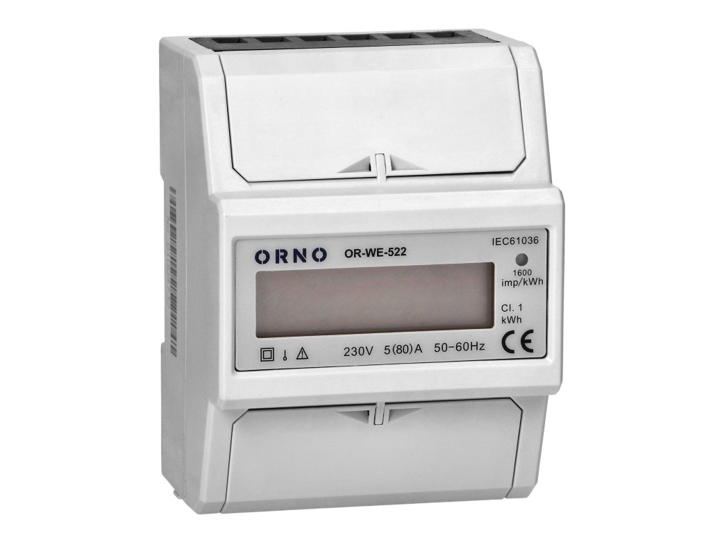 Zariadenie poskytujúce odpočty v metrických jednotkách (kWh), na priame meranie činného výkonu v jednofázovom systéme. Špeciálny elektronický obvod, keď je vystavený pretekajúcemu prúdu a aplikovanému napätiu, generuje impulzy v pomere k spotrebovanej elektrickej energii. Spotreba energie je indikovaná blikajúcou LED diódou. Počet impulzov sa premieňa na spotrebovanú energiu a jeho hodnota je indikovaná LCD displejom (6+1). Napájanie: 230V~, 50Hz, základný prúd: 5A, max. prúd: 80A, pulzná frekvencia: 1600imp/kWh, presnosť odčítania: trieda 1, namontovaný na 35 mm lište.