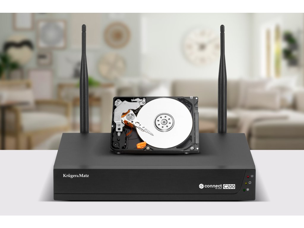 Dodávaný DVR podporuje maximálnu kapacitu 4 TB. Táto kapacita stačí až na mesiac nahrávania vo vysokej kvalite Full HD. Vďaka monitorovaciemu systému Kruger&Matz Connect C200 neunikne vašej pozornosti nič.