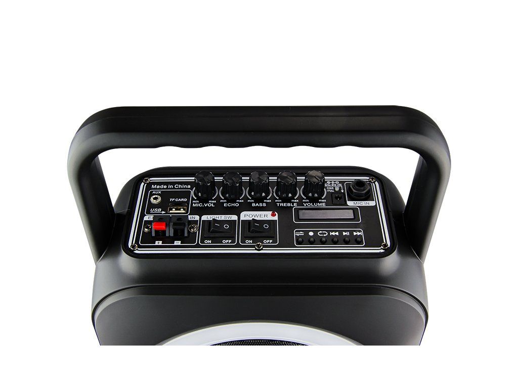 Aj napriek svojim rozmerom sa reproduktor pohodlne prenáša. Vďaka zabudovanej batérii a praktickému prevedeniu je vhodný na domáce používanie, terasu, záhradu, chalupu aj vonkajšie stretnutia. LED podsvietenie dodá hudbe aj celej atmosfére výraznejší efekt.
