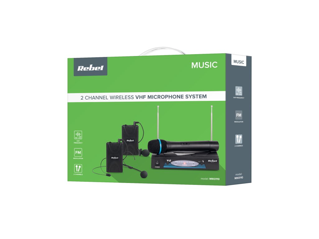 Súčasťou balenia: prijímač, 2 ručné mikrofóny, 2 prípojné mikrofóny, 2 hlavové mikrofóny, 2 bezdrôtové vysielače, napájací zdroj, kábel 6,3 mm jack