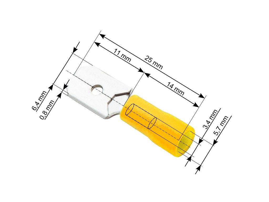 Konektor samec žltý 43-036- je izolovaný plochý konektor určený na rýchle a spoľahlivé elektrické spojenie vodičov. Vďaka prevedeniu 6,3/0,8 mm je vhodný pre bežné montážne, opravárenské aj servisné práce v elektroinštaláciách. Žlté PVC prevedenie uľahčuje orientáciu pri montáži a pomáha rýchlo zvoliť správny typ podľa prierezu vodiča.