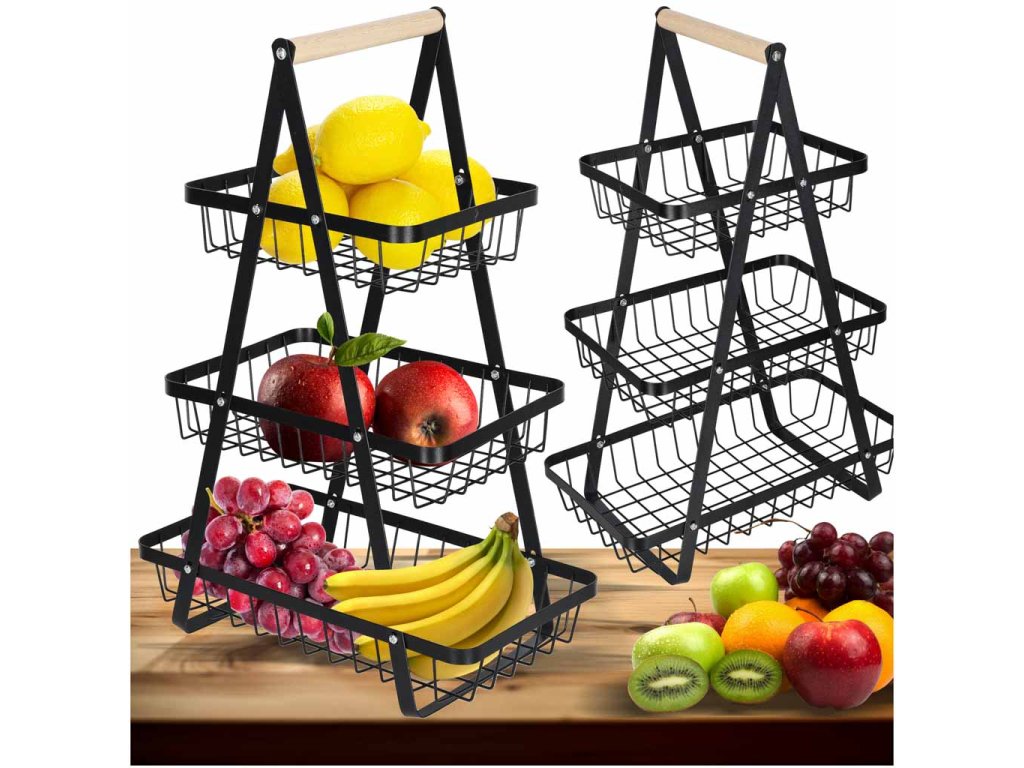 Kôš na ovocie čierny trojposchodový kovový drevený