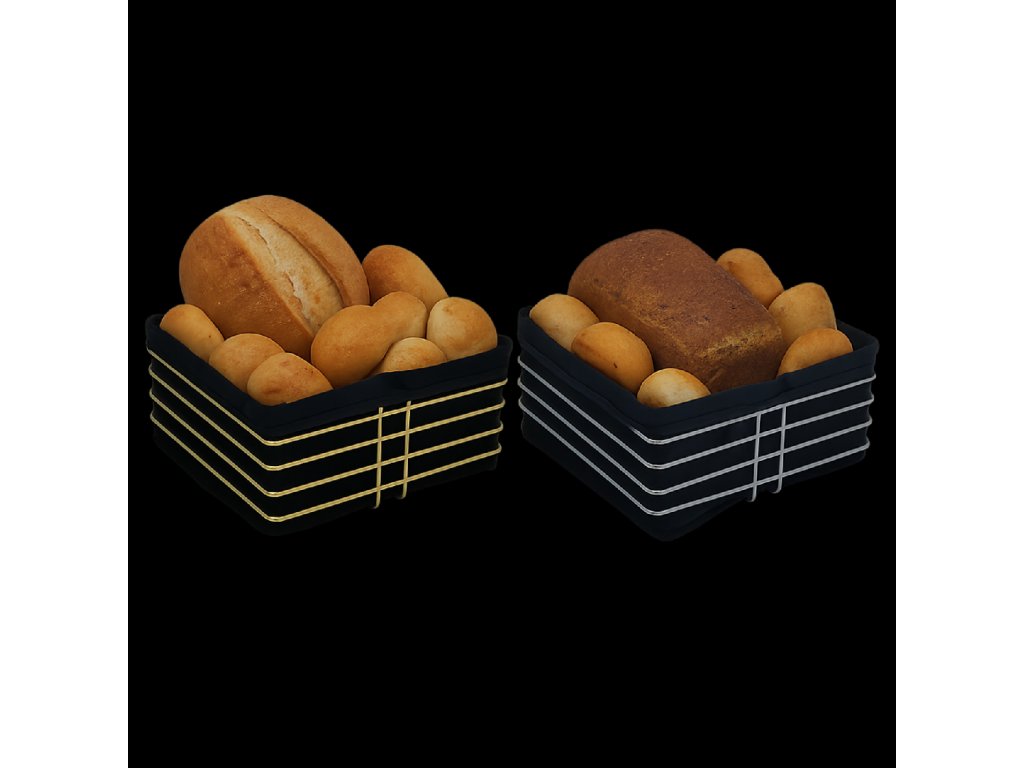 Košík na pečivo s čiernou vložkou. Na výber: chrómový (strieborný) alebo zlatý rám.Veľkosť: 21,5 x 21,5 x 11 cm.